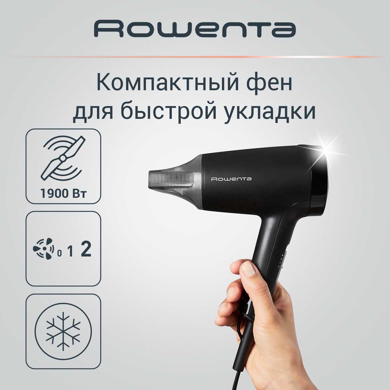 Мне подарили этот фен на день рождения. Сначала было непривычно, что он такой мощный, потому что раньше пользовалась простенькими и недорогими. Теперь сушка волос по утрам не занимает уйму времени и я могу подольше поспать)) Очень удобная функция холодный воздух, (при чем в этом фене он реально холодный, а не чуть тёплый) волосы не пересушиваются, а летом в жару без него вообще не выйти из дома. Такое ощущение, что волосы снова стали "живые". Профессиональный мотор работает без перебоя, а пользуемся феном мы втроём! Моя оценка этому прибору 5+, Ровента держит марку!