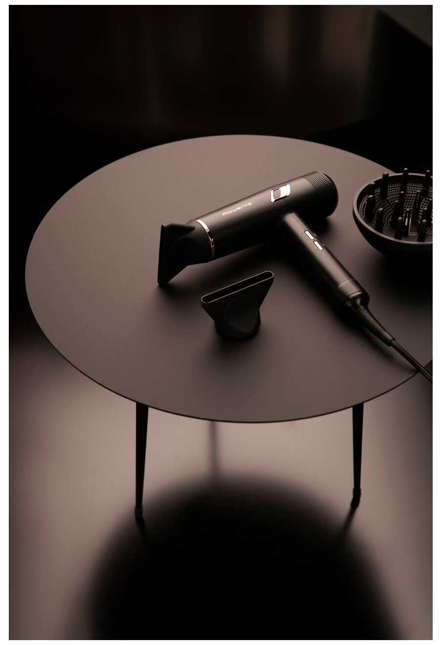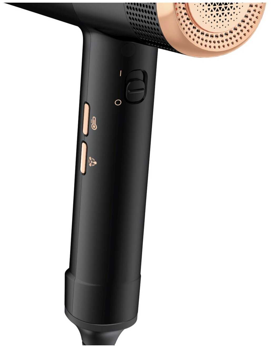 - 3 режима температуры (50°C, 80°C, 100°C) и 3 скорости воздушного потока позволяют адаптировать сушку под тип волос.