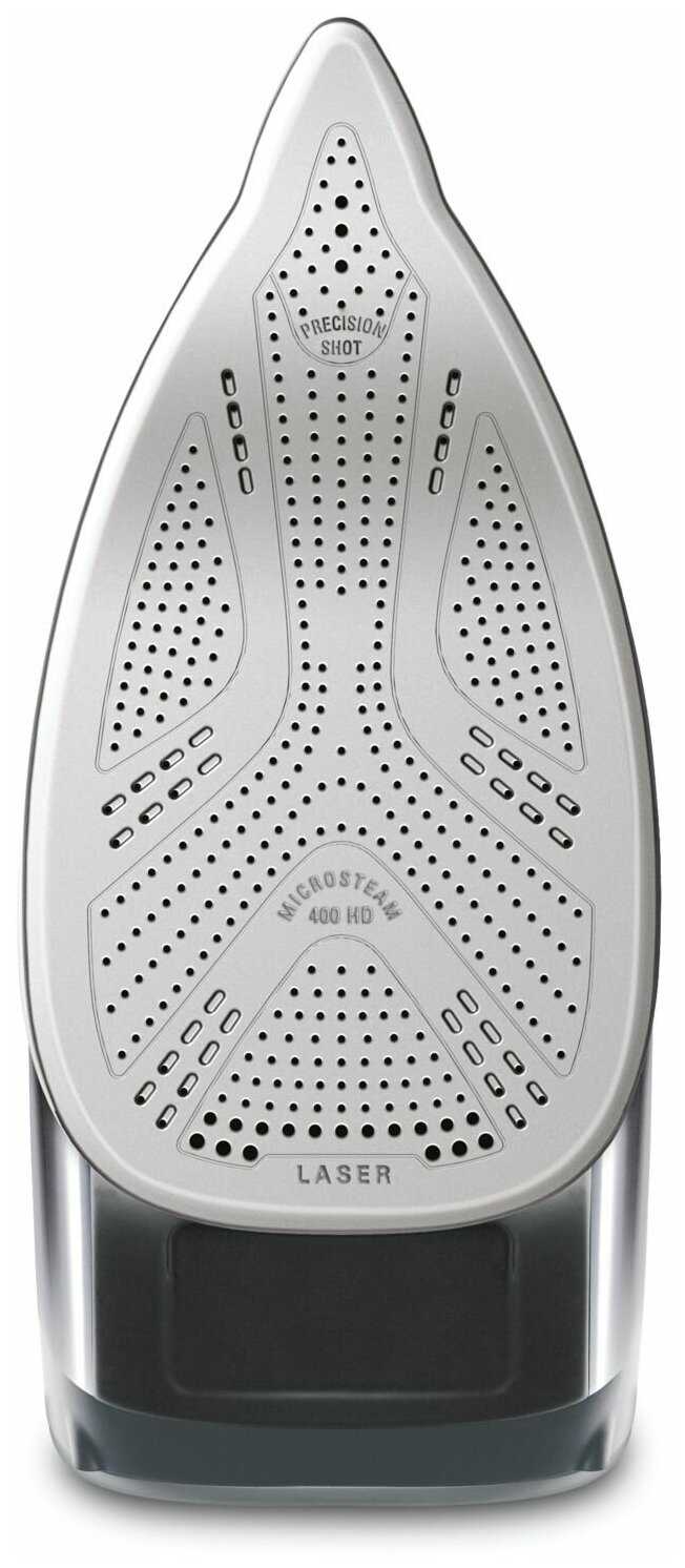 - Множество отверстий в подошве распределяют пар по всей поверхности, предотвращая локальные мокрые пятна и повышая качество глажки даже пересушенного белья.