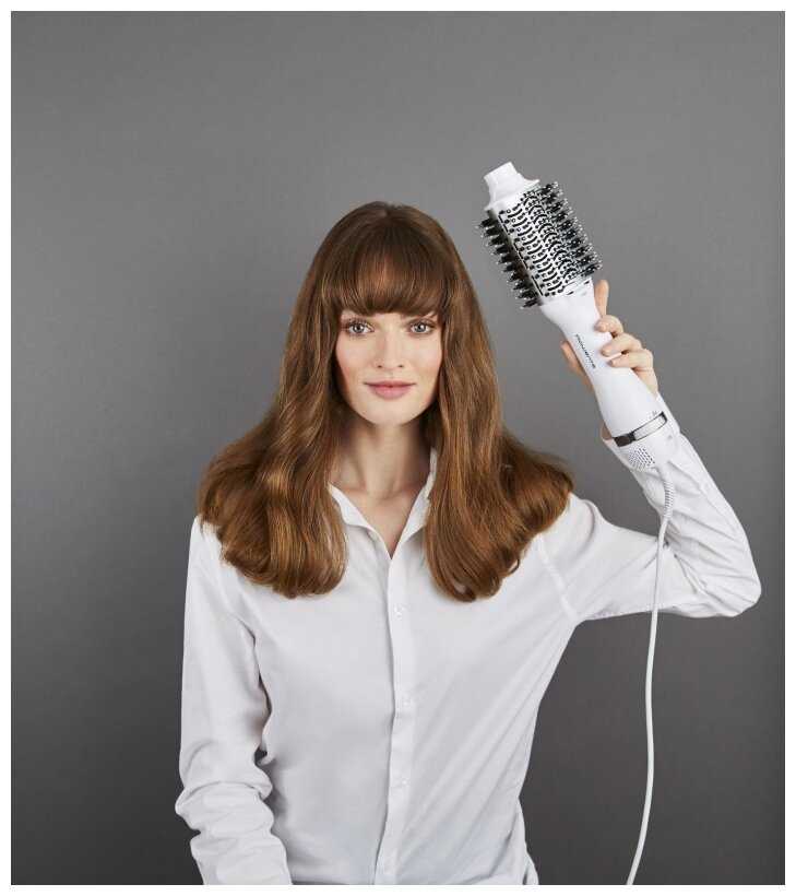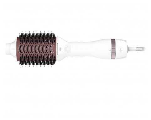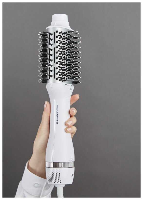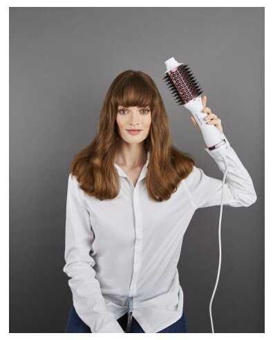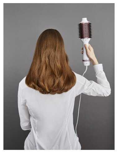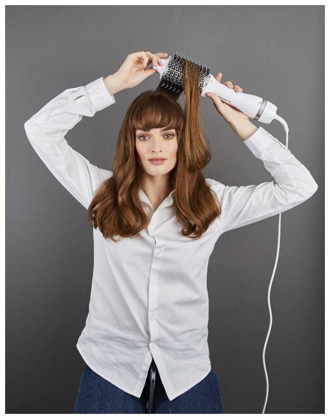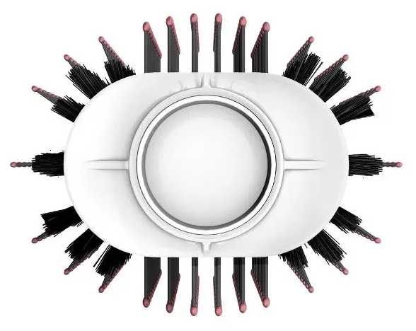 - Овальная форма щетки (диаметр 65 мм) создает объем у корней и подкручивает концы на длинных прядях.