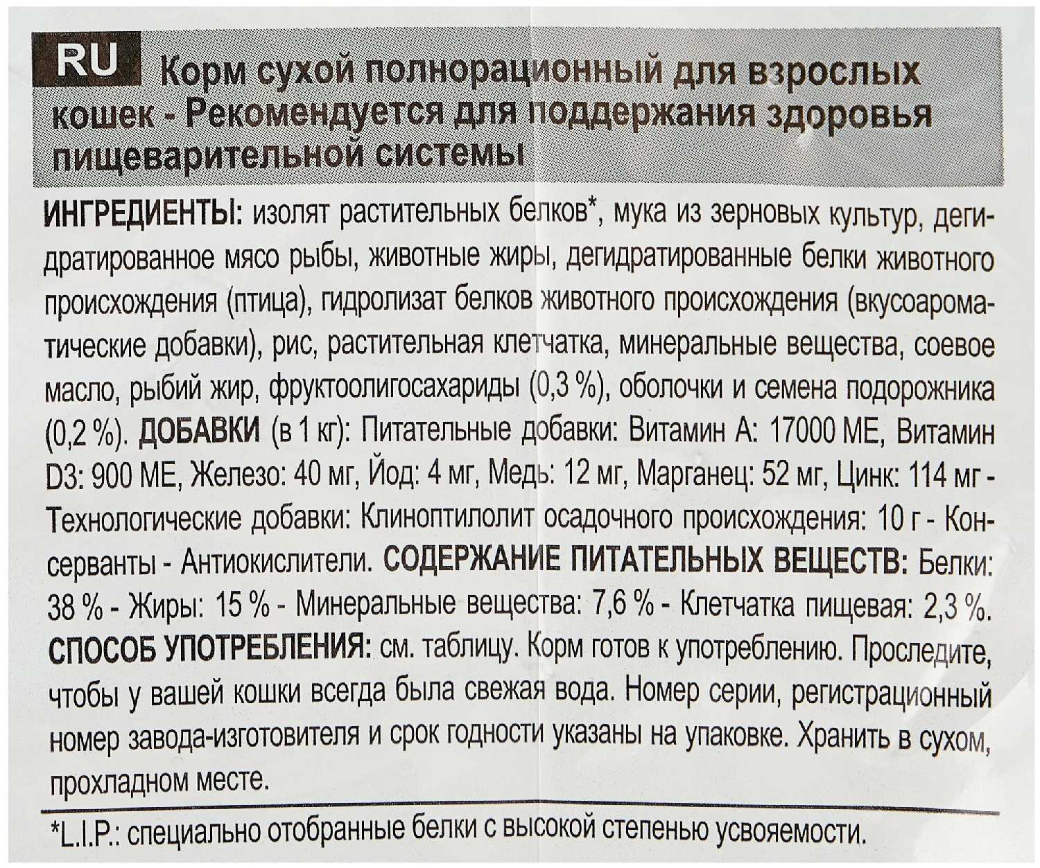 | Особые потребности : | для живущих в помещении, для здоровья кожи и блеска шерсти, для снижения запаха стула, для стерилизованных/кастрированных, при чувствительном пищеварении, профилактика зубного камня, профилактика избыточного веса |