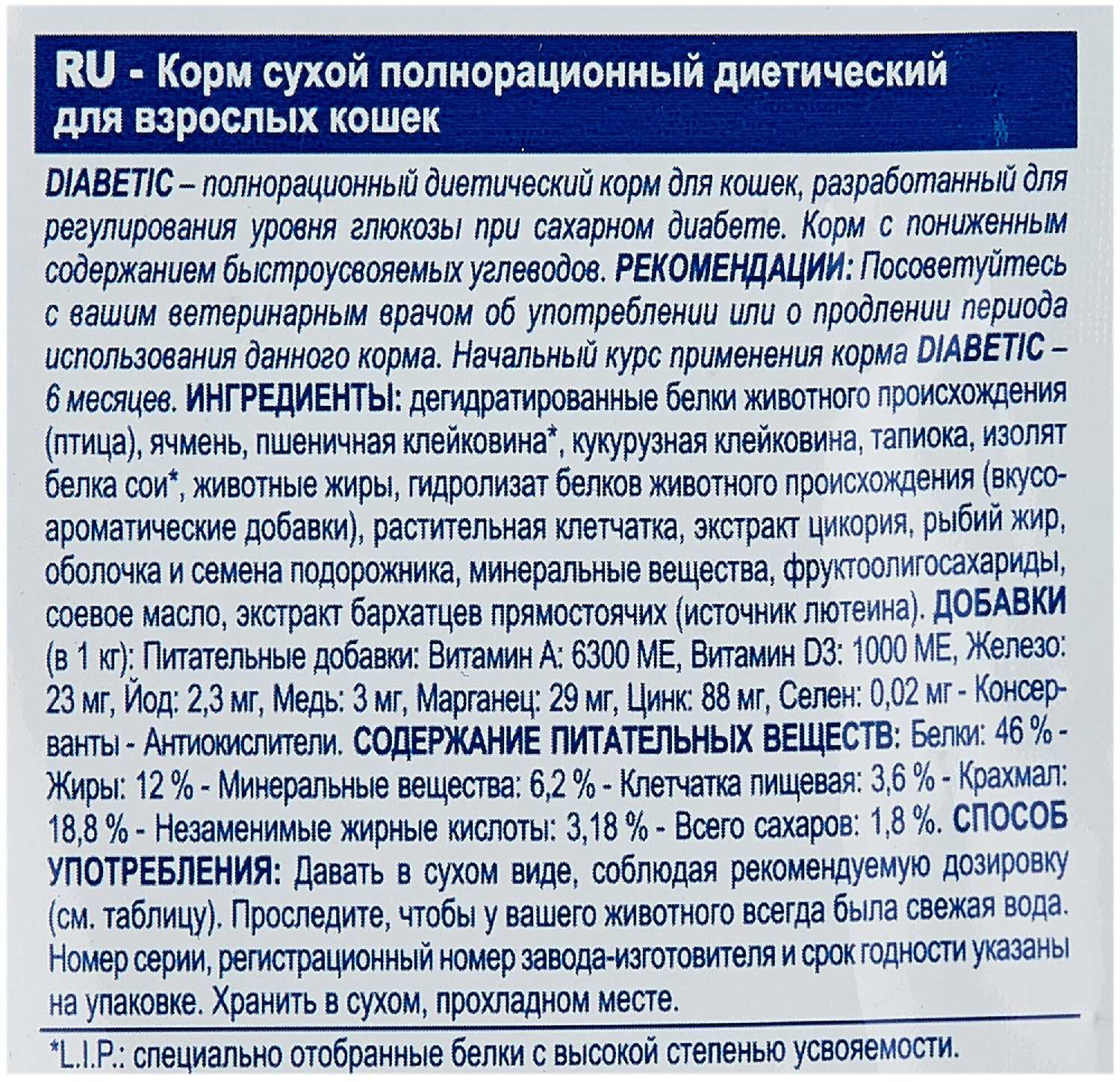 Дополнительная информация : | 1. Контроль уровня сахара в крови Особая формула для поддержания уровня глюкозы в крови после кормления у кошек, больных сахарным диабетом. 2. Высокое содержание белка Формула, богатая белком. Поддержание мышечной массы крайне важно для кошек, больных сахарным диабетом. 3. Низкое содержание крахмала Формула с пониженным содержанием крахмала. |