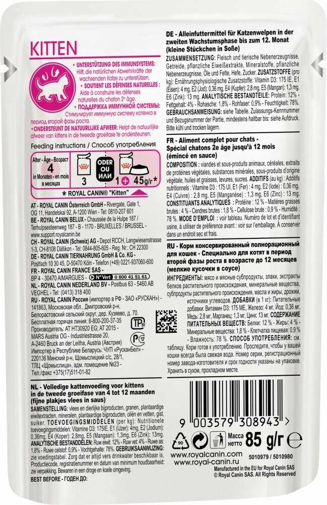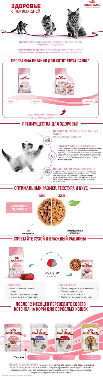 Сравнение с аналогами и целевая аудитория: В сравнении с кормами масс-маркета Royal Canin позиционируется как продукт с более сбалансированным составом и без избытка вкусовых добавок, что отмечают владельцы, чьи животные отказывались от других брендов. Продукт демонстрирует стабильное качество и predictable поведение животных после кормления, что делает его предсказуемым выбором для владельцев. Идеальными пользователями являются владельцы котят, нуждающиеся в безопасном и nutritionally complete рационе для обеспечения здорового роста, а также владельцы питомников, где корм используется для питания разновозрастных групп животных. Корм хорошо зарекомендовал себя для животных с чувствительным пищеварением, не склонных к аллергическим реакциям, что подтверждается многолетним опытом использования. При этом продукт может не подходить животным с индивидуальными вкусовыми предпочтениями или уже сформировавшейся привычкой к другим текстурам и ароматам.