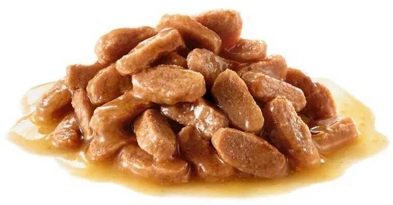 Кусочки корма небольшие и мягкие, что идеально подходит для котят с их мелкими зубами и нежными челюстями. Они представлены в желе или соусе, который многие питомцы находят очень привлекательным. Мягкая текстура облегчает процесс поедания и не требует от котенка значительных усилий. Владельцы отдельно отмечают, что именно консистенция в соусе является самой любимой у их питомцев. -