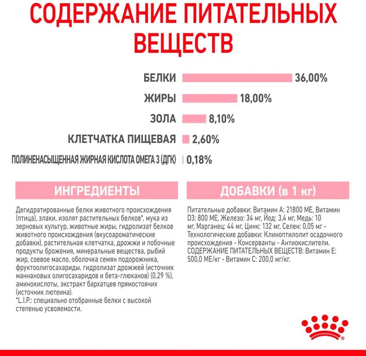 | Дополнительная информация : | 1) Поддержание иммунитета: Фаза роста - ключевой период в формировании иммунитета котенка. На этом этапе иммунная система котенка развивается постепенно. Корм Kitten способствует формированию естественных механизмов защиты котенка благодаря запатентованному* комплексу антиоксидантов, в том числе витамина Е. *Франция, патент №EP1146870. 2) Здоровая пищеварительная система: Повышенная усвояемость корма благодаря высокоусвояемым белкам (L.I.P.*) и пребиотикам (в том числе фруктоолигосахаридам). *Специально отобранные белки с высокой степенью усвояемости. 3) Здоровый рост: Адаптированное содержание протеинов, витаминов и минералов, в том числе витамина D и кальция. Высокая калорийность, отвечающая потребностям животного в период интенсивного роста. 4) L.I.P. - технология высокой усвояемости: Специально отобранные белки с коэффициентом усвояемости выше 90 % (Royal Canin) |
