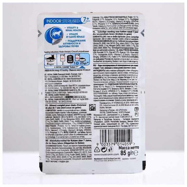 | Особые потребности : | для живущих в помещении, для стерилизованных/кастрированных, профилактика МКБ, профилактика избыточного веса |