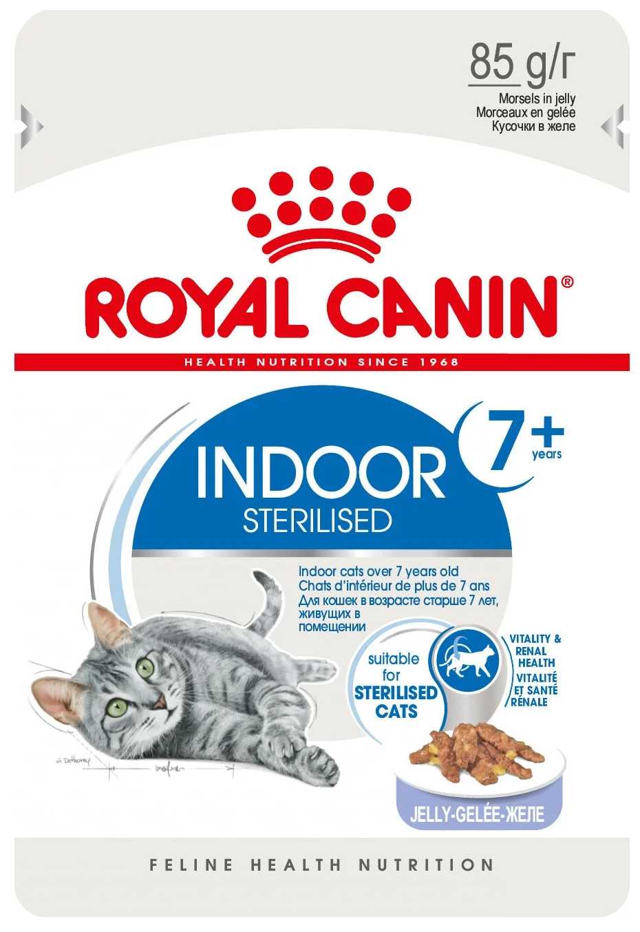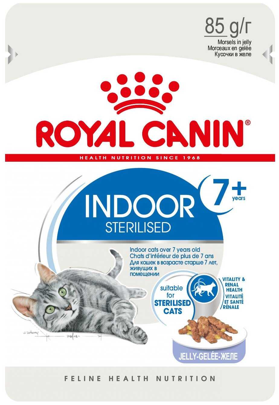 Очень удобный корм. Советую его, а не в соусе, так как желе намного удобнее выкладывать. Если вы немного потресете его, откроете, то выдавливая маленькая полосочка под словом sterilized отделит вам примерно половину пачки, что очень удобно при разделении пачки на два приёма пищи при сочетании с сухим кормом.