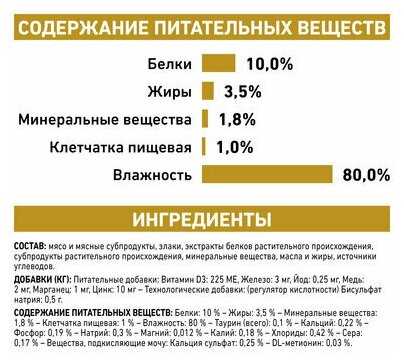 | Ветеринарная диета : | в период восстановления после болезни, для лечения МКБ, при избыточном весе, при проблемах с ЖКТ, при проблемах с почками |