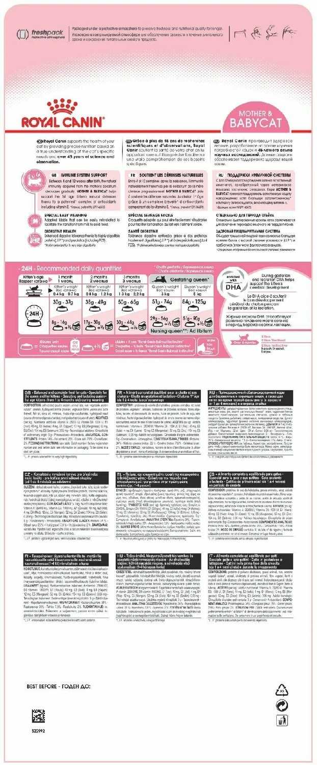 Дополнительная информация : | поддержание иммунитета: с 4 по 12 неделю после рождения котенка естественный иммунитет приобретенный с молозивом матери постепенно снижается корм MOTHER & BABYCAT помогает поддерживать естественную защиту новорожденных котят благодаря запатентованному комплексу антиоксидантов включающему витамин E, адаптированные крокеты которые легко размачиваются для облегчения перевода котенка с молока на твердый корм, здоровая пищеварительная система: повышенная усвояемость корма благодаря высокоусвояемым белкам и пребиотикам (в том числе фруктоолигосахаридам), содержит DHA: жирные кислоты DHA стимулируют мозговое развитие котенка в период беременности и лактации |