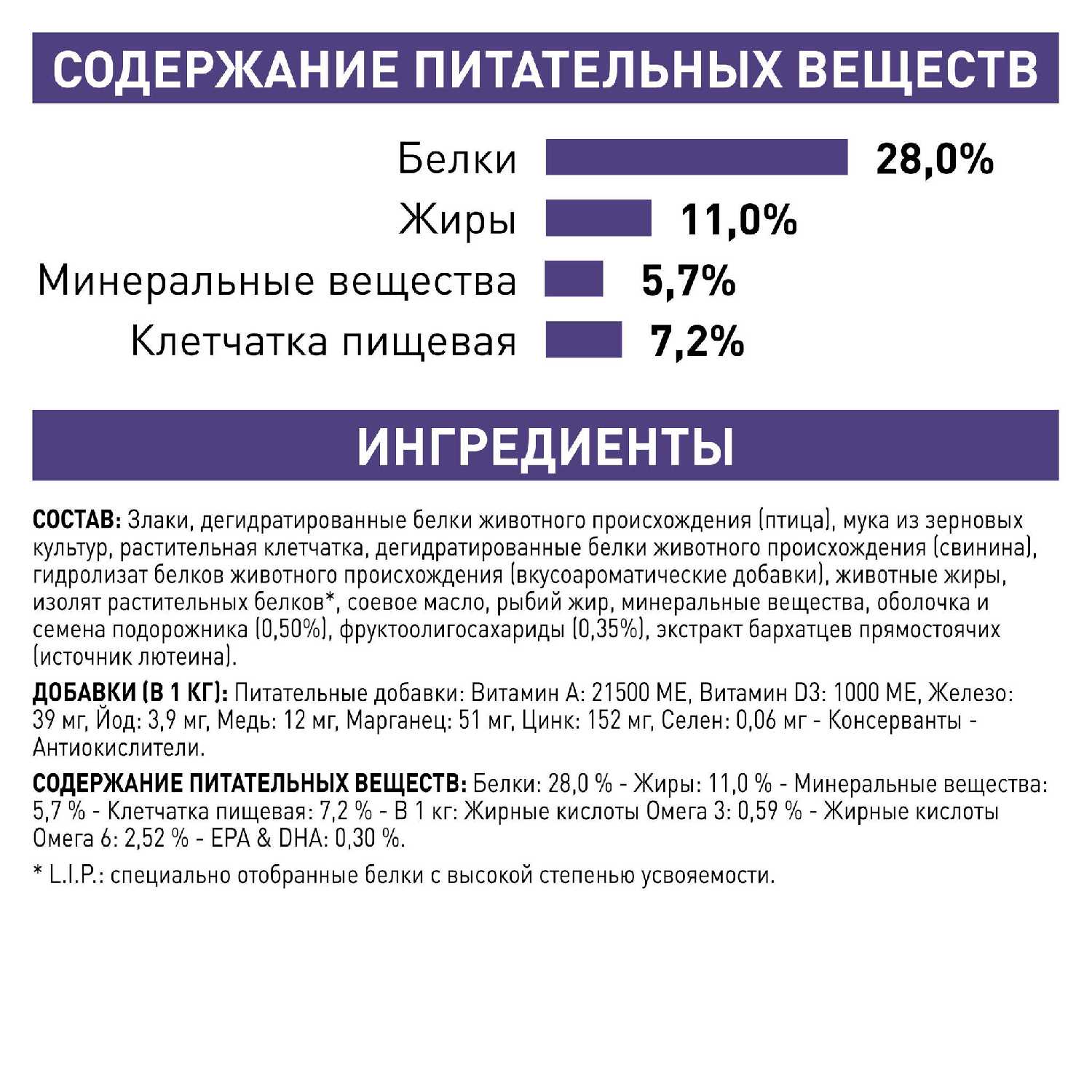 | Пищевая ценность : | на кг: белки: 28, 0 %, жиры: 11, минеральные вещества: 5, 7 %, клетчатка пищевая: 7, 2 %, в 1 кг: жирные кислоты омега 3: 0, 59 %, жирные кислоты омега 6: 2, 52 %, epa & dha: 0, 30 % |