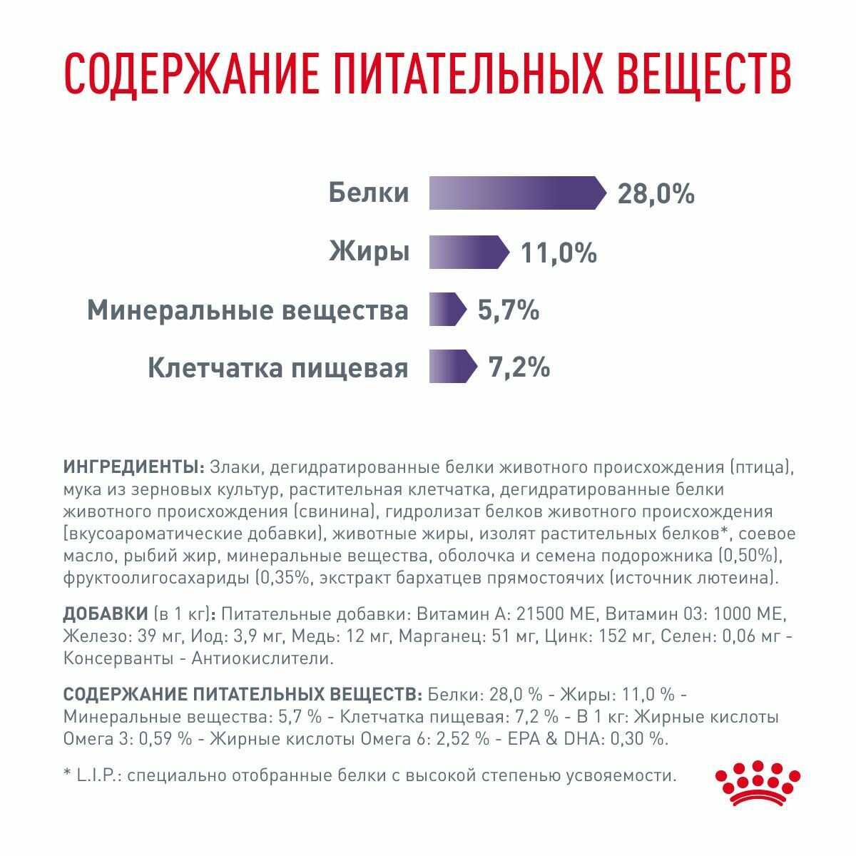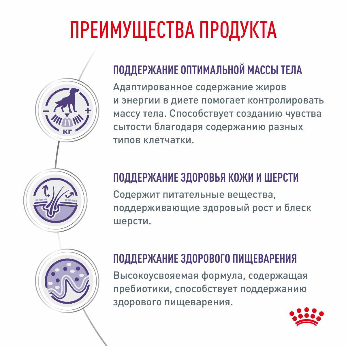| Дополнительная информация : | поддержание оптимальной массы тела адаптированное содержание жиров и энергии в диете помогает контролировать массу тела, способствует созданию чувства сытости благодаря сочетанию разных типов клетчатки, поддержание здоровья кожи и шерсти содержит питательные вещества поддерживающие здоровый рост и блеск шерсти, поддержание здорового пищеварения корм готов к употреблению проследите чтобы у вашей собаки всегда была свежая вода номер серии регистрационный номер завода-изготовителя и срок годности указаны на упаковке |
