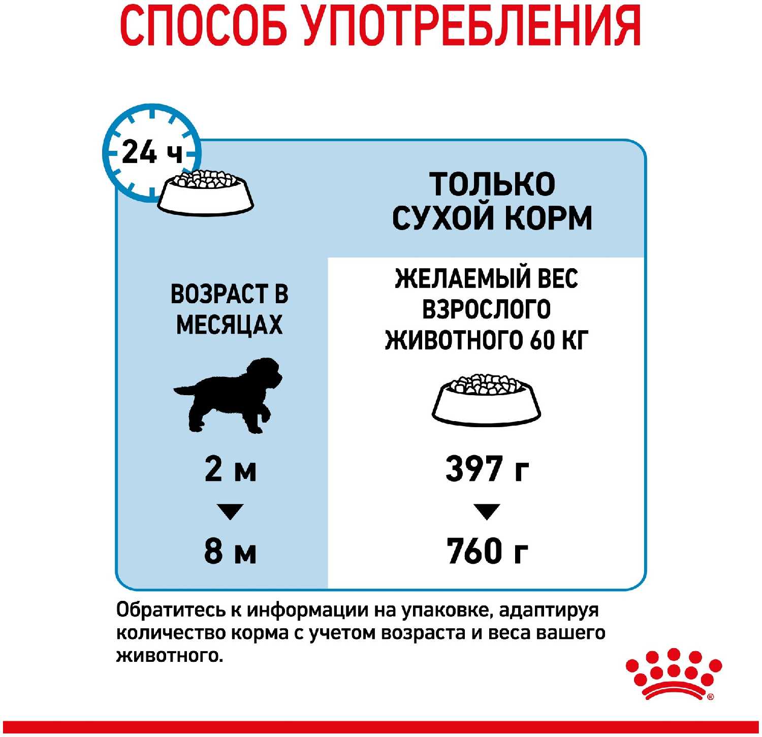 - Четкая маркировка на упаковке информирует владельцев о нормах кормления в соответствии с возрастом и весом щенка.