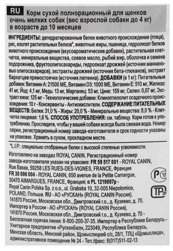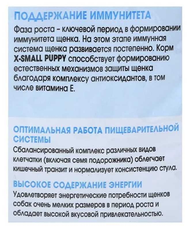На упаковке присутствует подробная таблица с нормативами кормления по возрасту и весу щенка. Владельцы находят ее понятной и точной — при соблюдении указанных порций проблем с недокормом или перееданием не возникает.