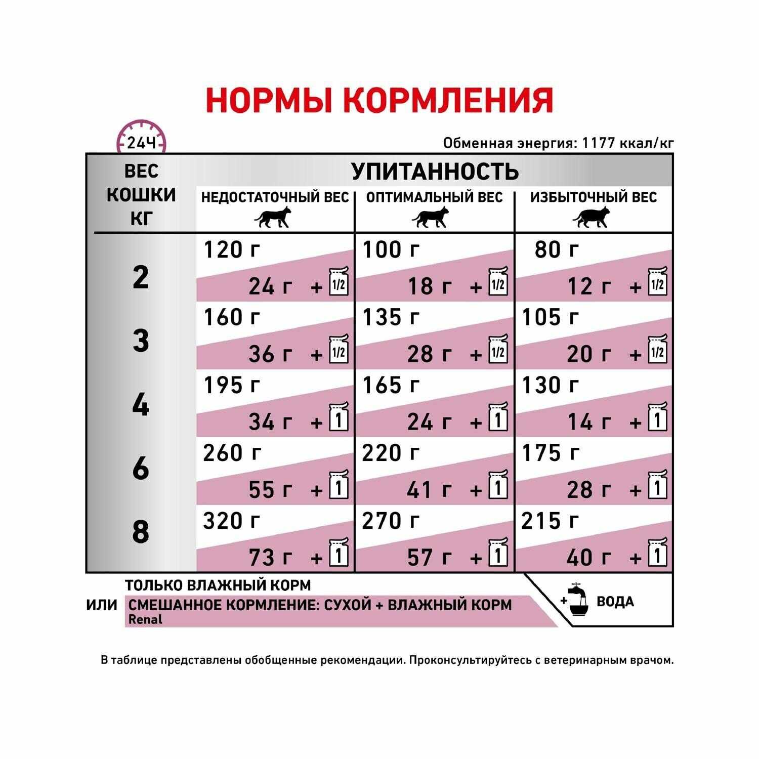 Режим и объём кормления определяются строго ветеринарным врачом в зависимости от веса, возраста и стадии заболевания кошки. Общая рекомендация — разделять суточную норму, указанную на упаковке, на несколько приёмов пищи. Важно обеспечить кошке постоянный доступ к свежей воде, особенно при питании влажными кормами. -