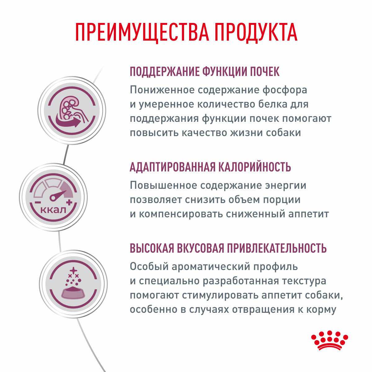 Дополнительная информация : | 1. Поддержание функции почек Пониженное содержание фосфора и умеренное количество белка для поддержания функции почек. 2. Адаптированная калорийность Повышенное содержание энергии позволяет снизить объем порции и компенсировать сниженный аппетит. 3. Высокая вкусовая привлекательность Особый ароматический профиль и специально разработанная текстура помогают стимулировать аппетит собаки, особенно в случаях отвращения к корму. |
