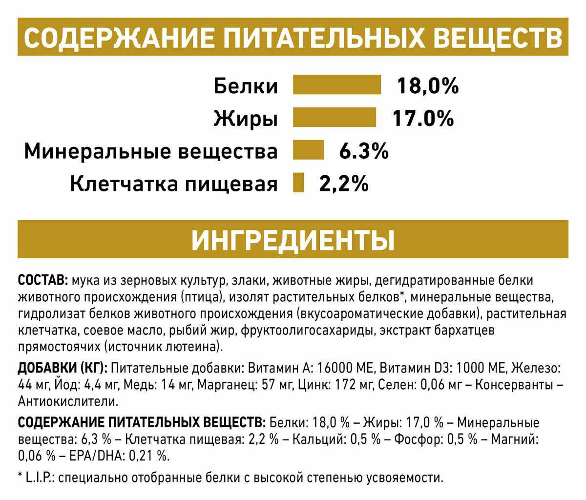 | Особые потребности : | для беременных/кормящих, для здоровья кожи и блеска шерсти, для здоровья костей и суставов, для профилактики МКБ, при проблемах с почками, при склонности к избыточному весу, при чувствительном пищеварении |