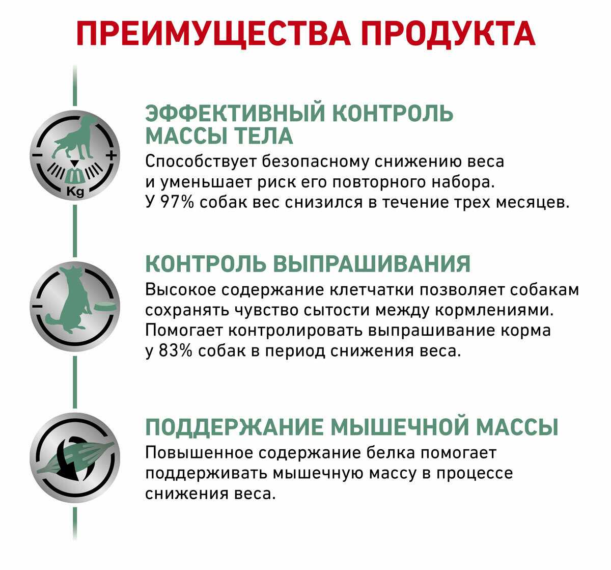 Дополнительная информация : | 1. Эффективный контроль массы тела Способствует безопасному снижению веса и уменьшает риск его повторного набора. У 97%* собак вес снизился в течение трех месяцев. *Для собак весом менее 10 кг рекомендуется продукт Satiety Small Dog 2. Контроль выпрашивания Высокое содержание клетчатки позволяет собакам сохранять чувство сытости между кормлениями. Помогает контролировать выпрашивание корма у 83% собак в период снижения веса 3. Поддержание мышечной массы Повышенное содержание белка помогает поддерживать мышечную массу в процессе снижения веса. |