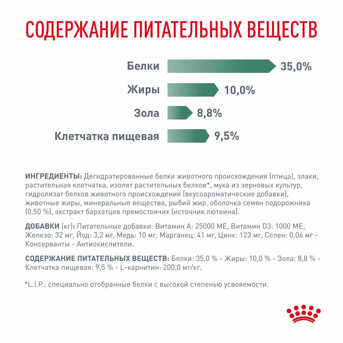 Особые потребности : | для здоровья кожи и блеска шерсти, при диабете, профилактика избыточного веса |