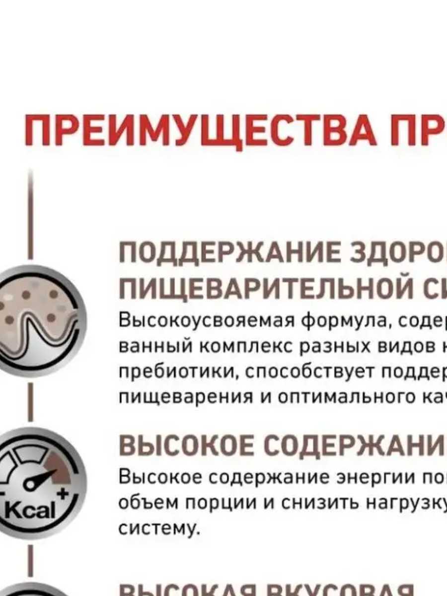 Особые потребности : | гипоаллергенный, для здоровья кожи и блеска шерсти, для здоровья костей и суставов, для определенных пород, для профилактики МКБ, для стерилизованных/кастрированных, для ухода за ротовой полостью, при чувствительном пищеварении |