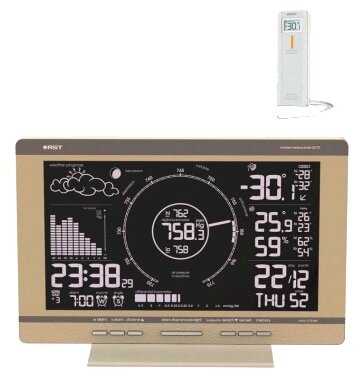 Большой экран. Круглая шкала барометра, близка к классическому виду. Есть шкала динамики роста,или спада давления в виде столбиков за 3 суток.Добротный корпус. На фото в интернете смотрится хуже,чем в реальности. Выносной датчик находит на ура,не теряет. Датчик пока расположился в крытом собачьем вальере в 20м от базы. Сигнал идет через стену с окном. Планирую в дальнейшем сам датчик расположить в доме на подоконнике,а зонд вывести на улицу. - - Дисплей. Желательно смотреть чуть сверху,тогда цифры наиболее яркие. Не показывает влажность на улице. Для такой цены могли бы и сделать. Много лишнего на экране. Будильники,часы,указатель номера недели в году. Покупаешь вроде как метео прибор,но никак не часы с будильником. Режим постоянной анимации фазы луны и динамики роста ,или спада давления. Раздражает это постоянное шевеление на экране. Нет разноцветной подсветки в зависимости от погоды. В настройках невозможно установить...