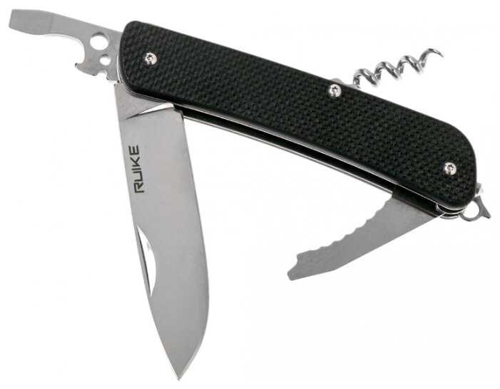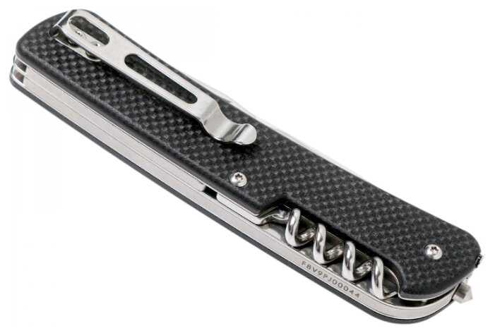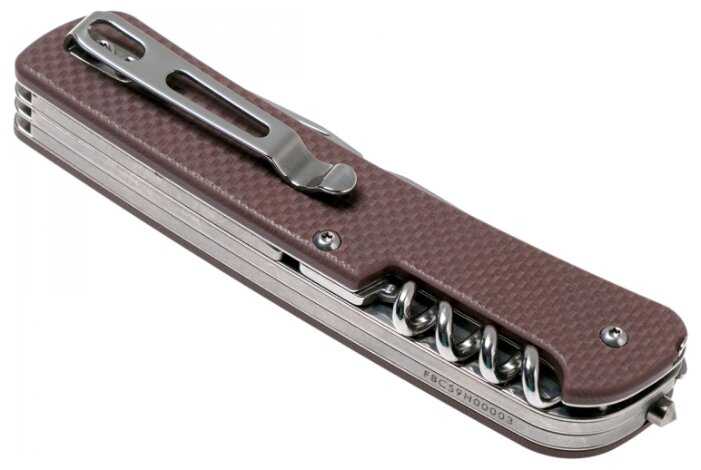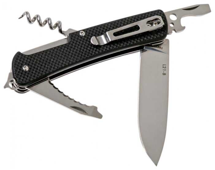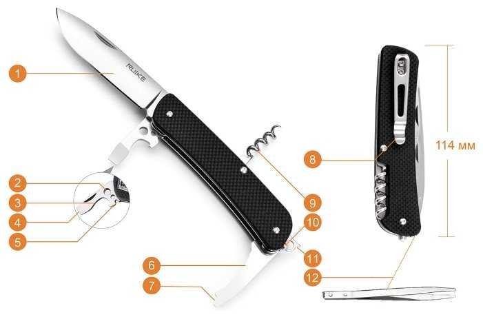 Инструменты (функции) : | Длинное лезвие Инструмент для закручивания проволоки Открывалка для бутылок Большая отвертка 6,5 мм Инструмент для оголения провода Стропорез Малая отвертка 3 мм Карманная клипса Штопор Стеклобой Кольцо для ключей/ темляка Пинцет |