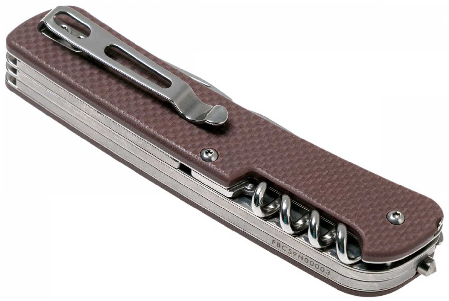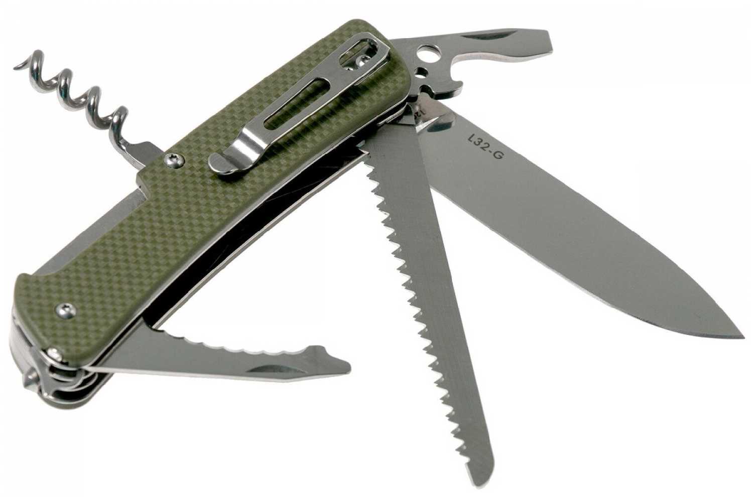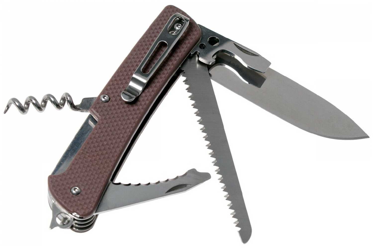 Инструменты (функции) : | длинное лезвие пила по дереву инструмент для закручивания проволоки открывалка для бутылок большая отвертка 6,5 мм инструмент для оголения провода стропорез малая отвертка 3 мм карманная клипса штопор стеклобой кольцо для ключей/ темляка пинцет |