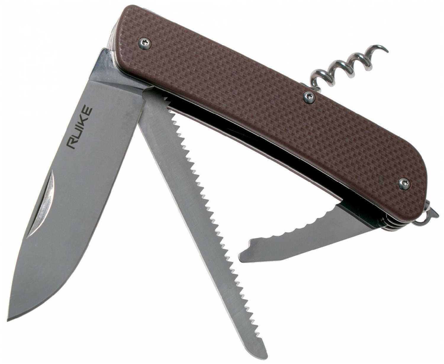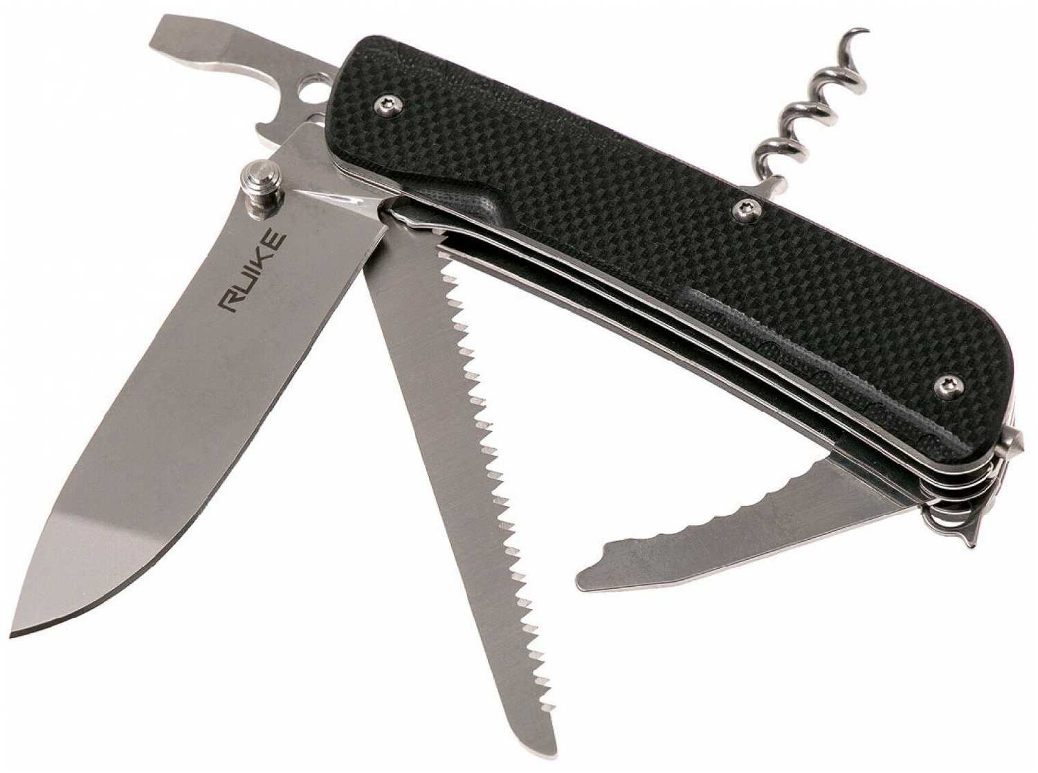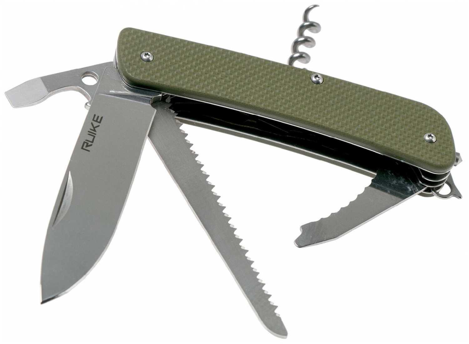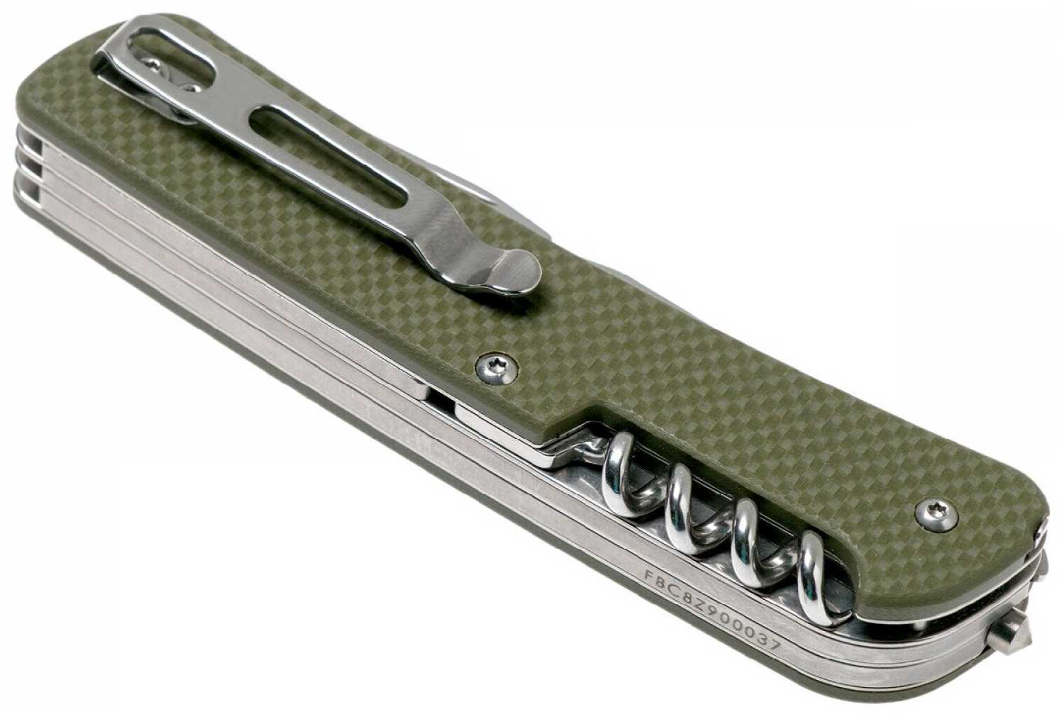 Инструменты (функции) : | длинное лезвие пила по дереву инструмент для закручивания проволоки открывалка для бутылок большая отвертка 6,5 мм инструмент для оголения провода стропорез малая отвертка 3 мм карманная клипса штопор стеклобой кольцо для ключей/ темляка пинцет |