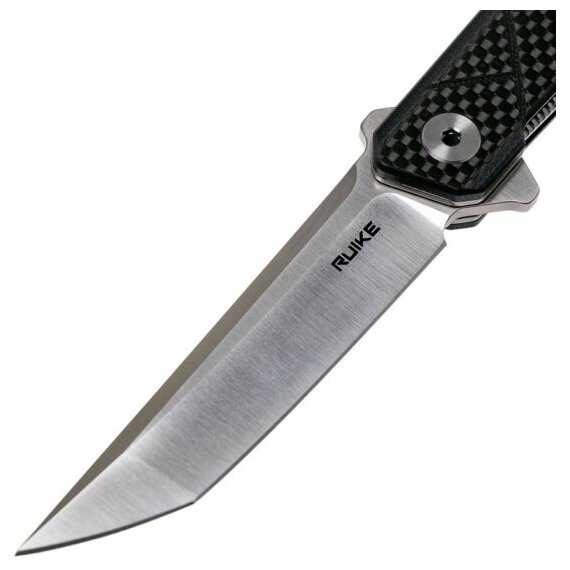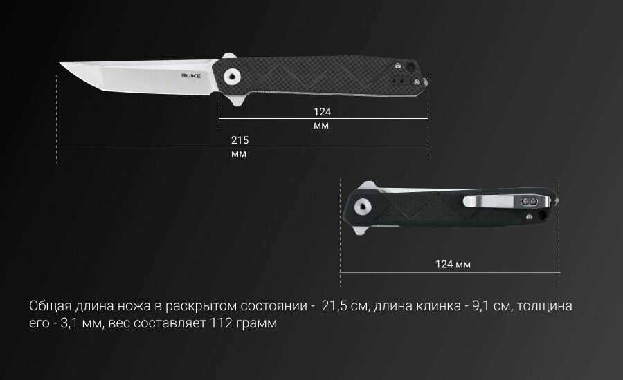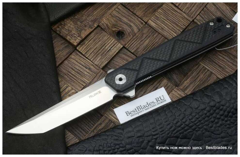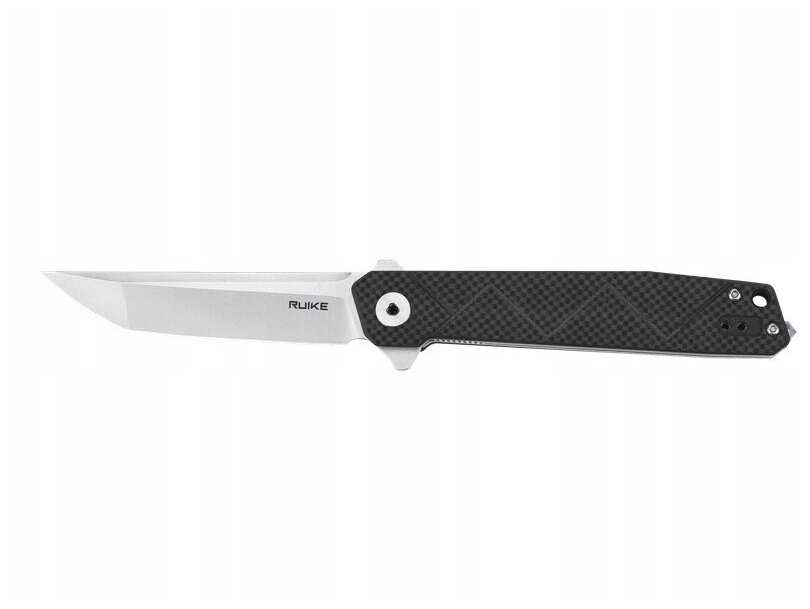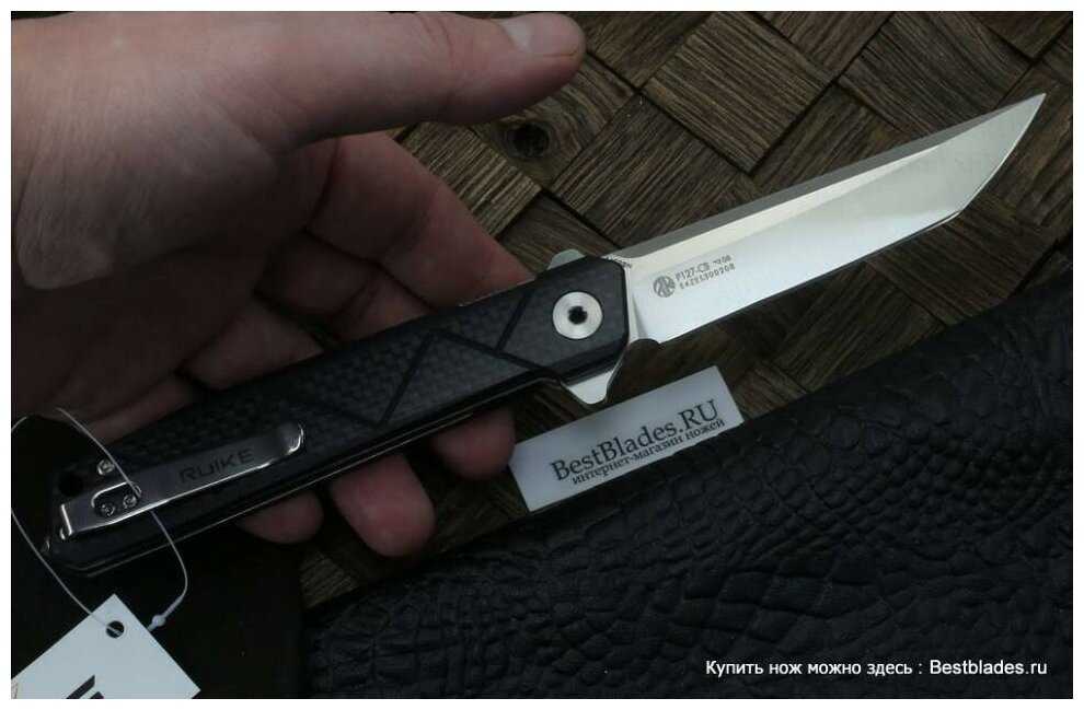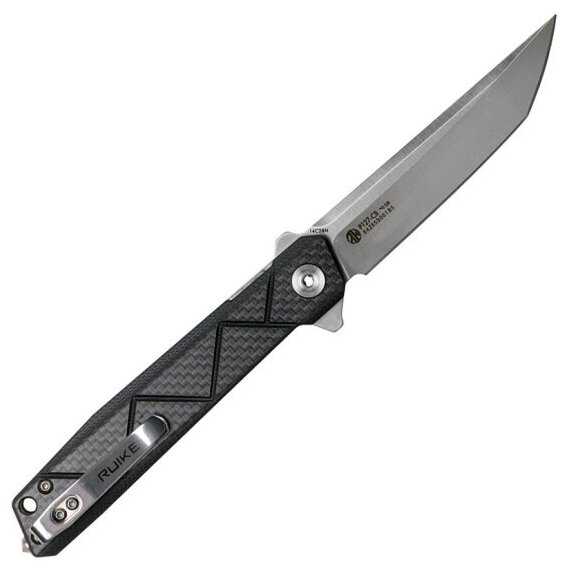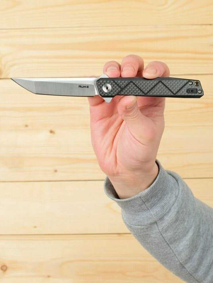 - + С брендом Ruike знаком давно. Отличный edc нож, сталь sandvik, довольно хорошо держит заточку, великолепная сборка - никаких люфтов, прекрасный механизм фиксации лезвия - лайнер лок с замком для гарантированной фиксации. Карббоновая накладка - чисто декор, но выглядит приятно. Выступы у основания клинка, используемые для открытия ножа, работают как фальш-гарда, не давая руке соскользнуть.