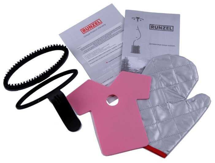 В комплекте идут дополнительные насадки, термоперчатка и дощечка для отпаривания манжетов и рукавов.