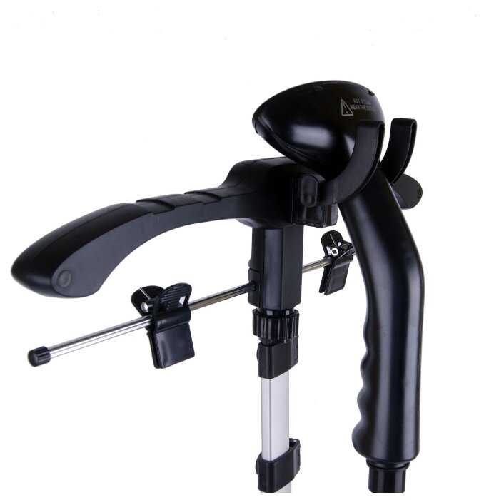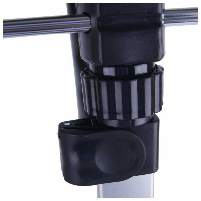 Телескопическая стойка Т-образная, имеются плечики и вешалка с зажимами для брюк.