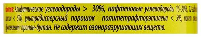 Состав : | алифатические углеводороды, ультрадисперсный порошок политетрафторэтилена, синтетическое связующее, функциональные добавки |