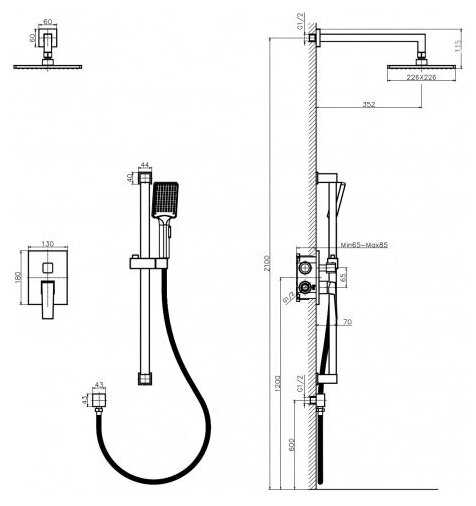 | Комплектация : | верхний душ, дивертор, душевая стойка, душевая штанга, излив для набора воды, лейка, ручной душ, смеситель, шланг |