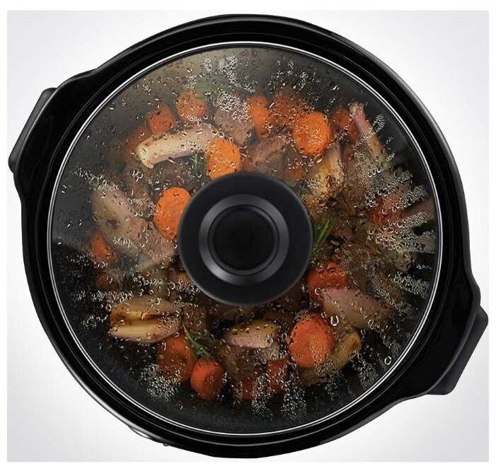 - + Плюсы такие: можно загрузить продукты в кастрюлю и забыть на несколько часов, еда будет готовиться сама. Овощи, даже очень тонко порезанный картофель, не развариваются, сохраняют форму. Мясо, рыба тоже. Выкладывала в кастрюлю полуразмороженные куски мяса, рыбы, готовилось всё отлично, только время на готовку прибавлять...