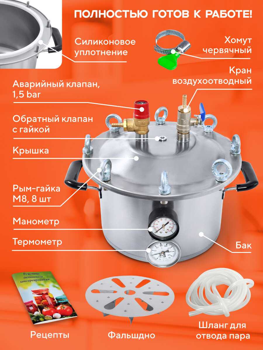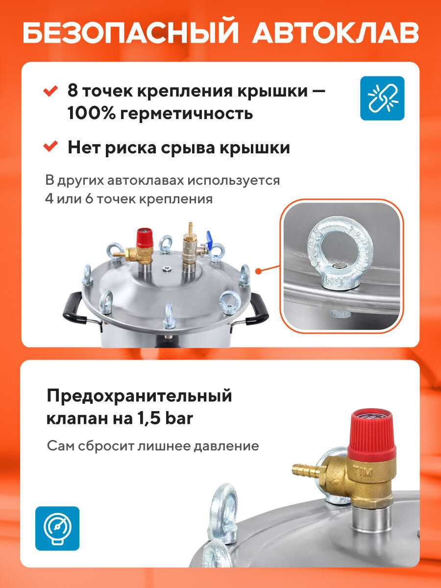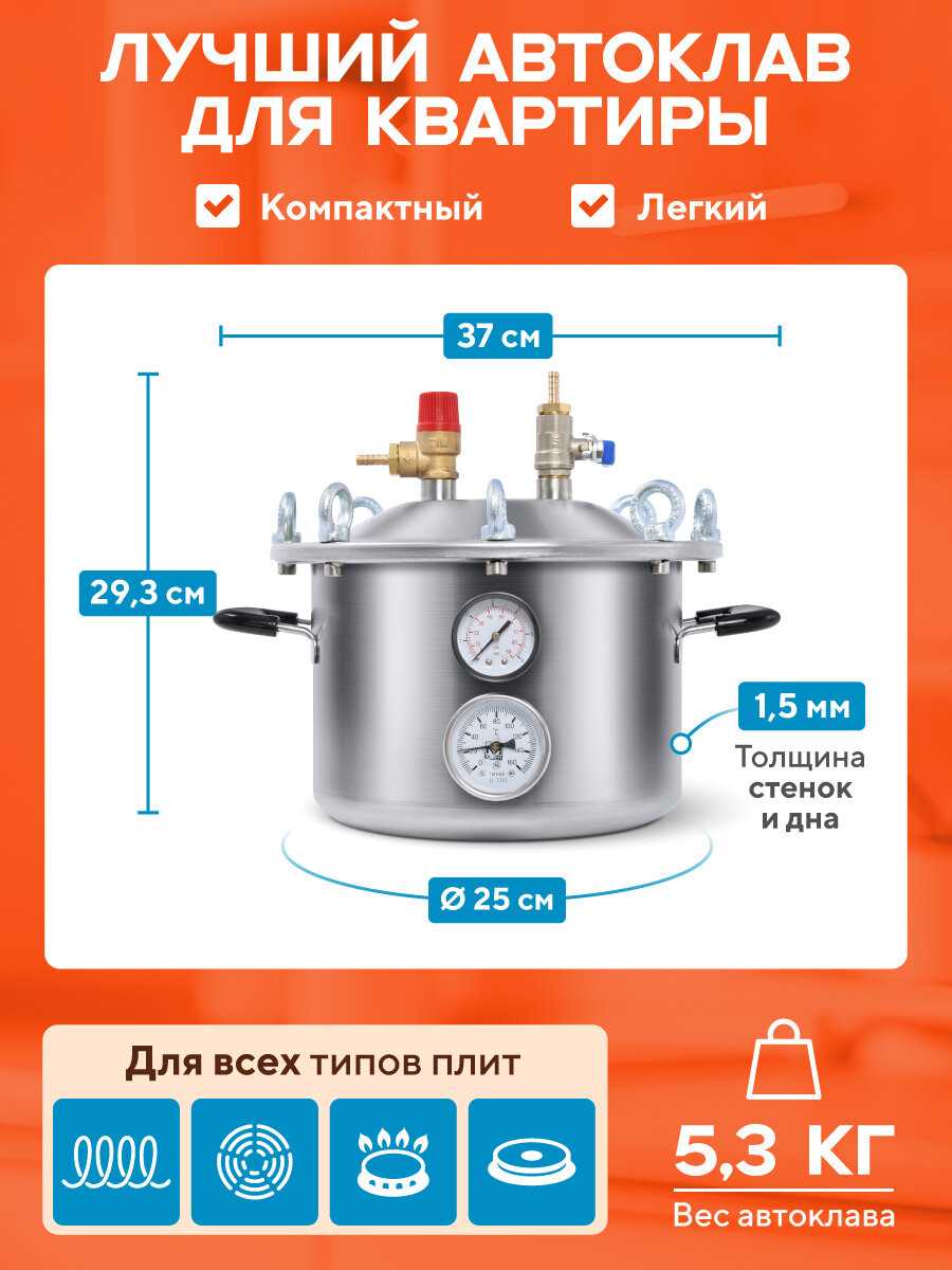 | Дополнительная информация : | На крышке автоклава есть стандартное 1, 5-дюймовое кламповое отверстие. При желании вы можете снять заглушку, установить на ее место бражную колонну и использовать автоклав как самогонный аппарат! |