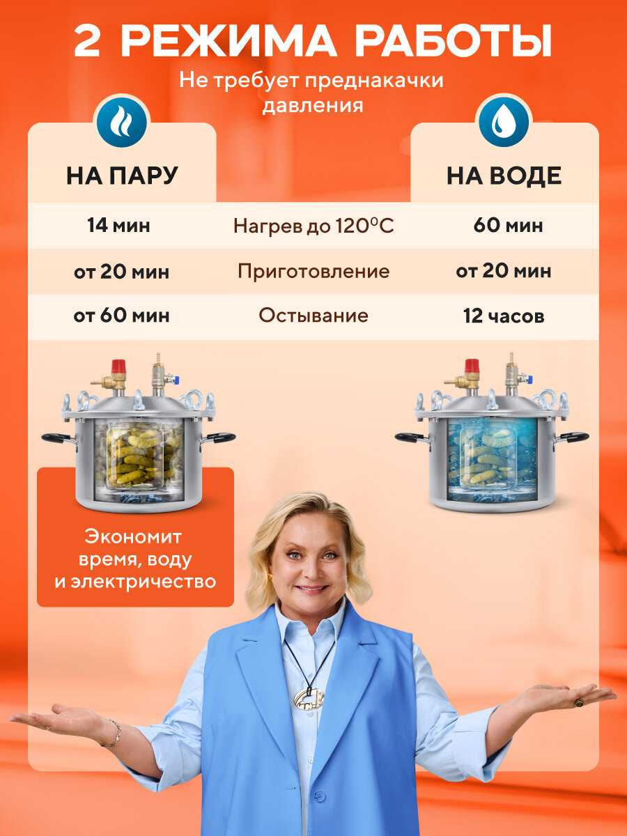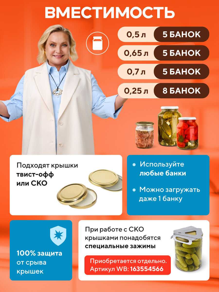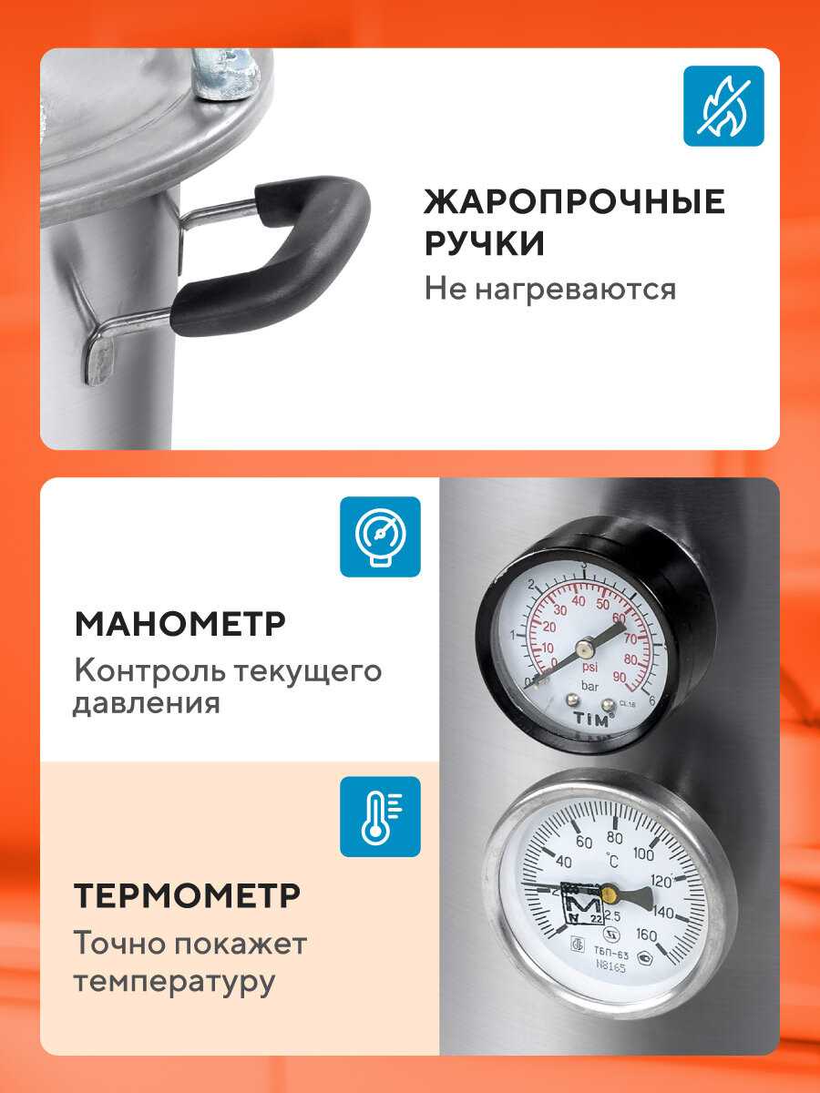 | Дополнительная информация : | На крышке автоклава есть стандартное 1, 5-дюймовое кламповое отверстие. При желании вы можете снять заглушку, установить на ее место бражную колонну и использовать автоклав как самогонный аппарат! |