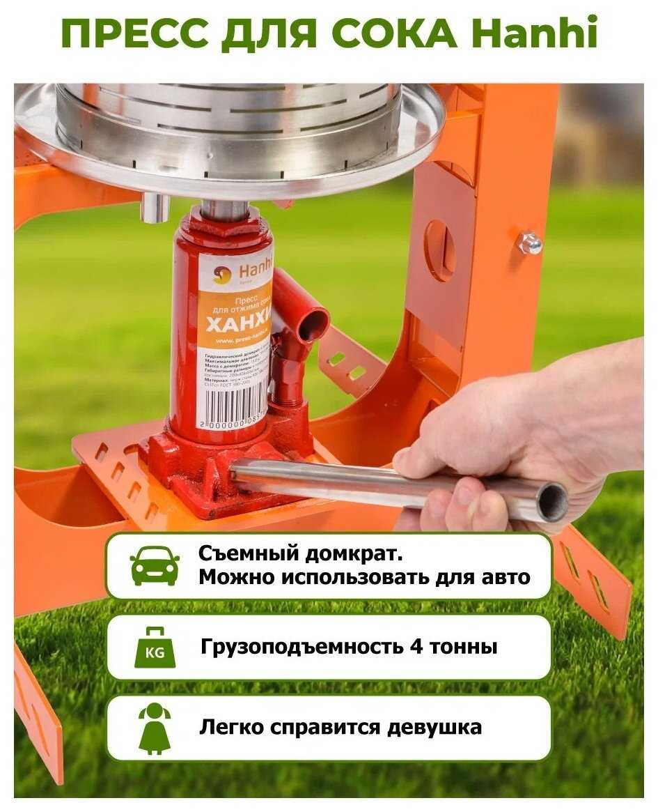 Дополнительная информация : | масса с домкратом - 158 кг давление - до 14 кг/кв.см габаритные размеры в собранном состоянии - 200х408х664 мм высота подхвата домкрата - до 200 мм подъем штока - до 130 мм максимальная грузоподъемность домкрата - 4 т материал конструкции контактирующей с продуктами - нерж. сталь AISI304 материал каркаса - сталь ст3ГспГост380-200, производительность – до 15 литров сока за 15 минут. |