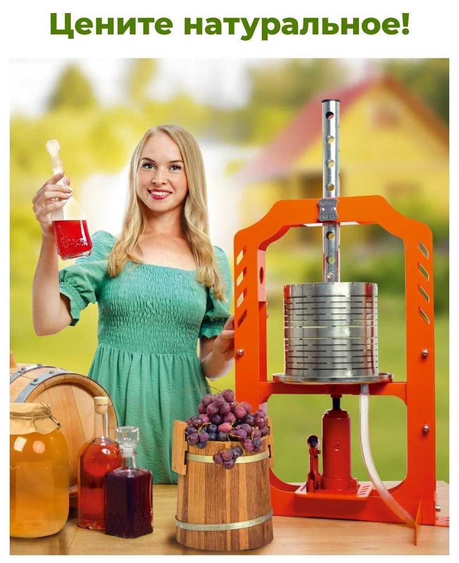 Подробная комплектация : | заглушка штока пресса – 1 шт, шток пресса– 1 шт, поршень– 1 шт, гайка колпачковая- 3 шт, винт м8х45 – 1 шт, корзина – 1 шт, основание поддона — 1 шт, поддон — 1 шт, ножка – 2 шт, шайба 2 шт, фиксатор штока пресса – 1 шт, корпус пресса – 1 шт, заглушка пластины под домкрат – 1 шт, основание пресса – 2 шт, пластина под домкрат – 1 шт, домкрат гидравлический – 1 шт, брызгогаситель (приобретается дополнительно) направляющие — 4 шт, шпильки м8х90 — 4 шт, винт м8х40 — 2 шт, рукоять домкарата — 1 шт, гайки барашки — 3 шт, гайки шестигранные м8 — 8 шт, шайба м6 — 3 шт, паспорт и руководство по эксплуатации изделия – 1 шт, трубка пвх 16мм, мешок лавсановый - 1 шт, книга «Вино и самогон» |