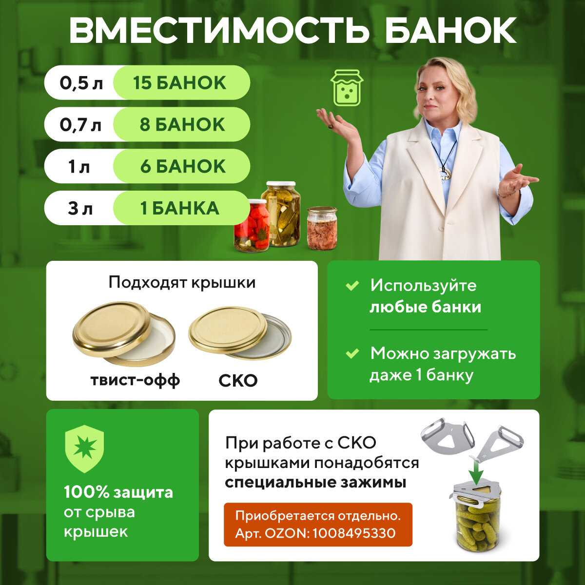 Простота эксплуатации: понятные режимы для пастеризации/стерилизации, индикация на панели, возможность автоматических циклов.