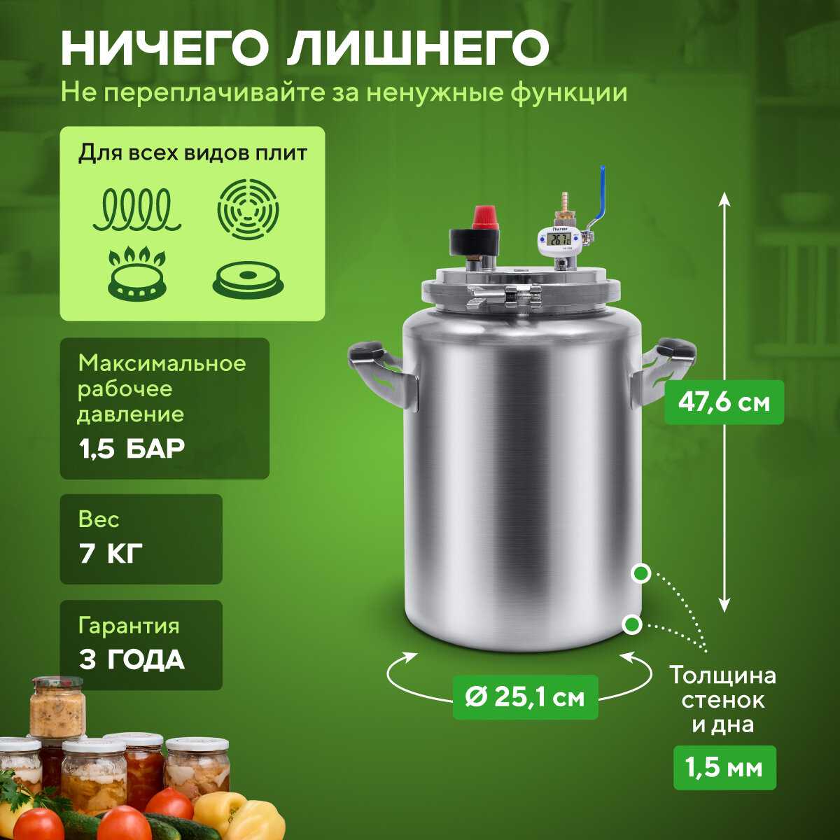 Итог: паровой автоклав для консервирования — эффективное решение для домашних или малых производственных заготовок, обеспечивающее надёжную стерилизацию и долгий срок хранения продуктов при грамотном режиме эксплуатации и соблюдении инструкций производителя.