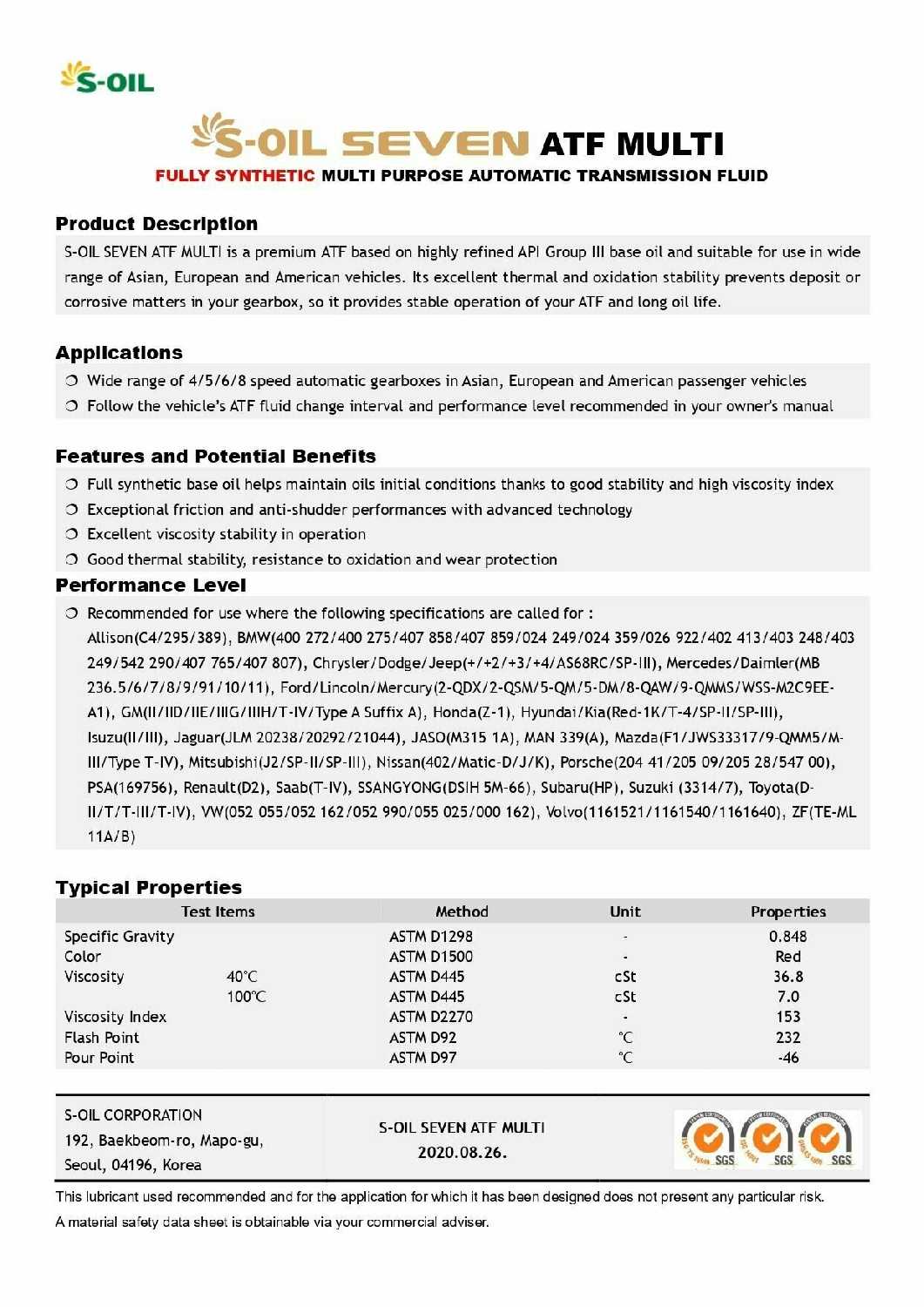 Характеристи S-OIL SEVEN ATF MULTI (1л)