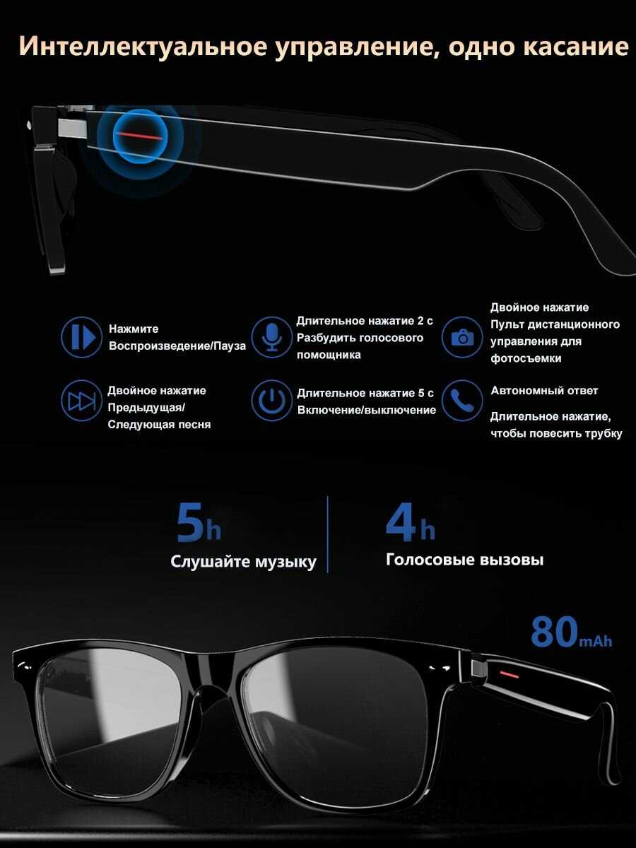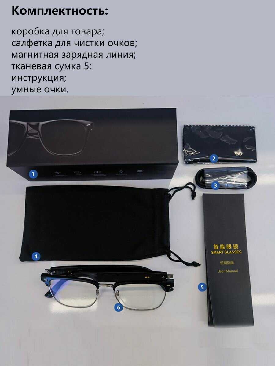 | Комплектация : | Умные очки, Инструкции, Линия зарядки, Упаковка |