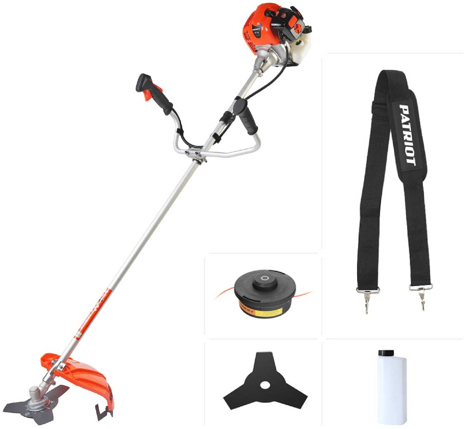 6/10 балловPATRIOT PT 448 (1+1), раб. объем 43сс, 2,5 л. с "велосипедная" рукоятка, катушка с леской ,3-х лопастной нож (255мм)