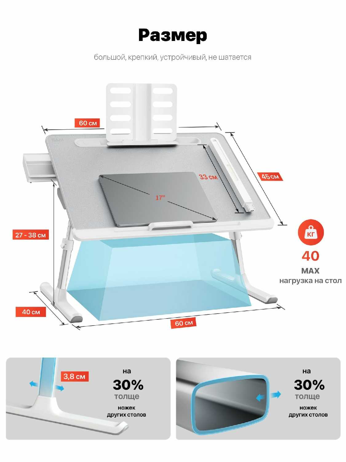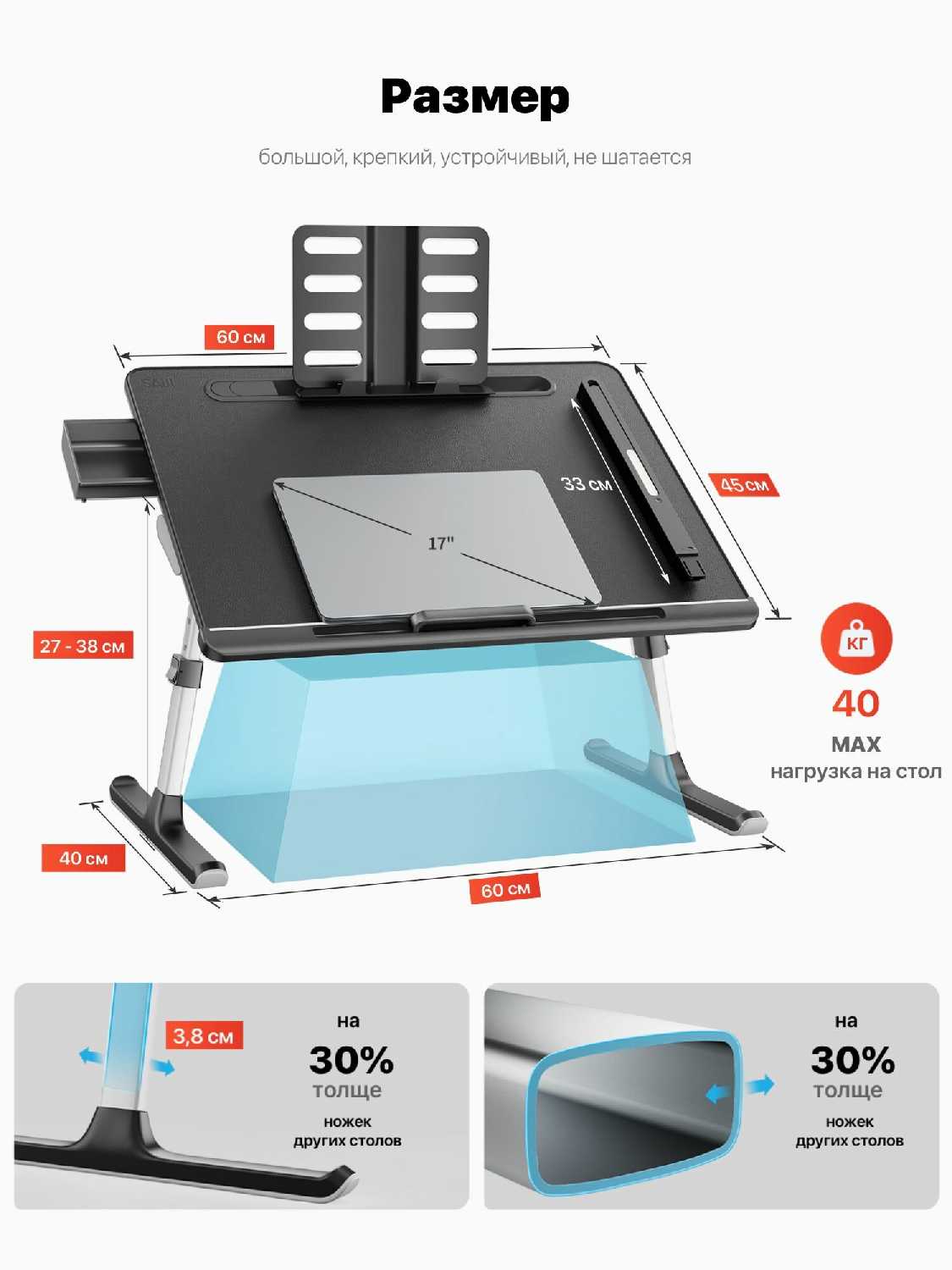 - + Конструкция удобная, регулируется в широком диапазоне, крепления производят впечатление прочных. Материалы основных узлов норм. Размер оптимальный. Довольно толковые мелочи в виде лампы, стопера от падения ноута, пенала, подставки для книги.