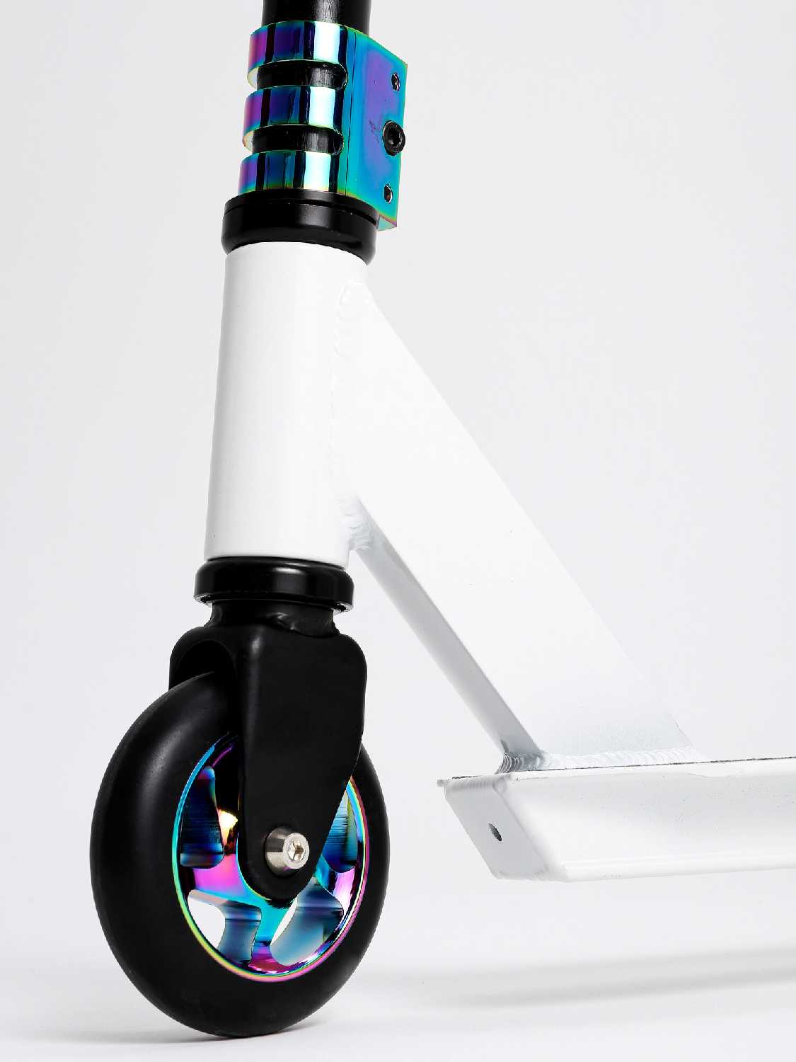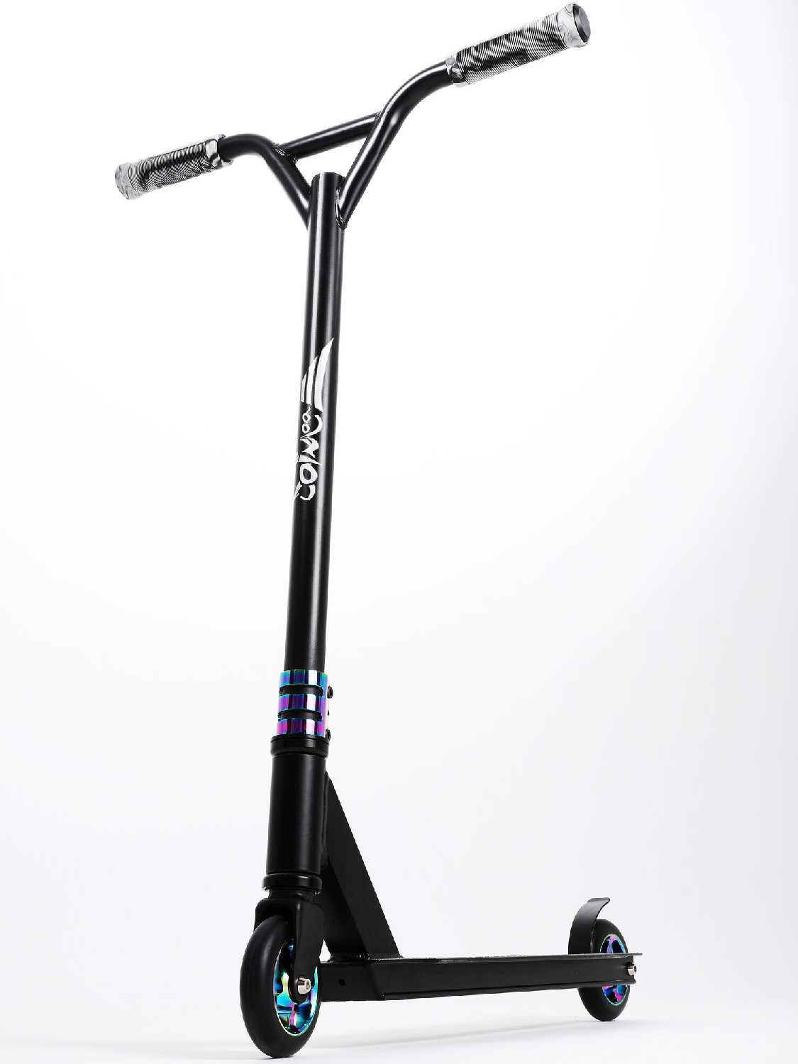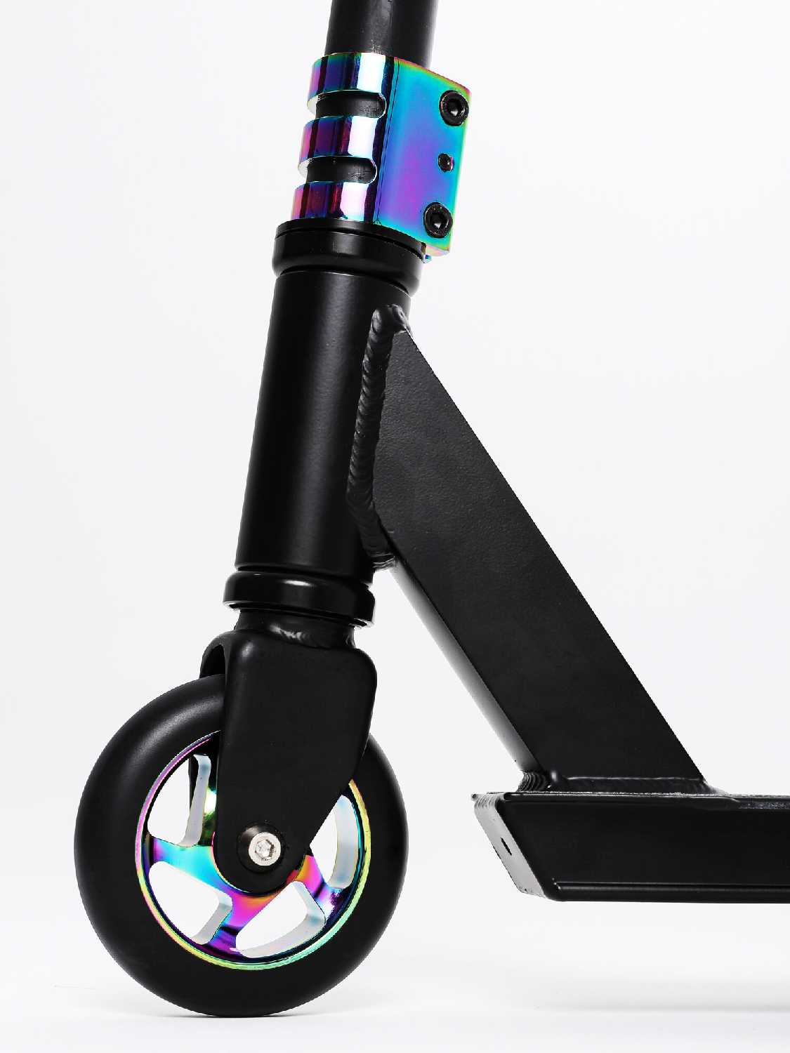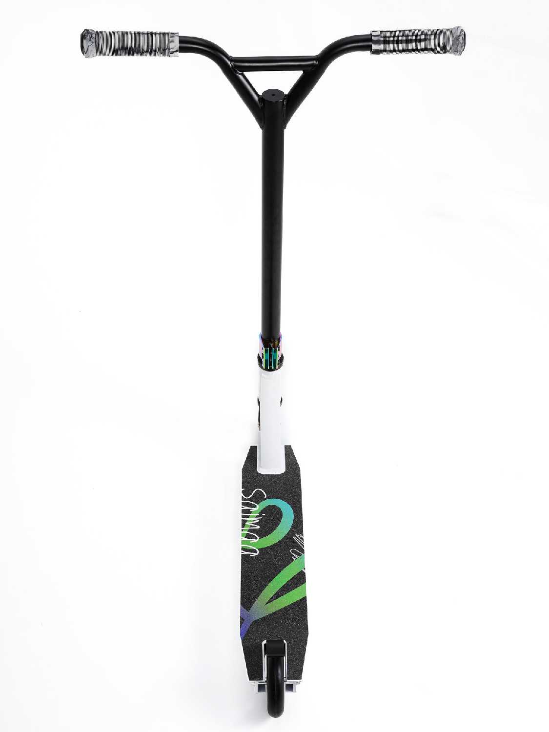 - Баланс между весом и геометрией рамы улучшает отзывчивость на руле, делая самокат подходящим для начинающих трюкачей.