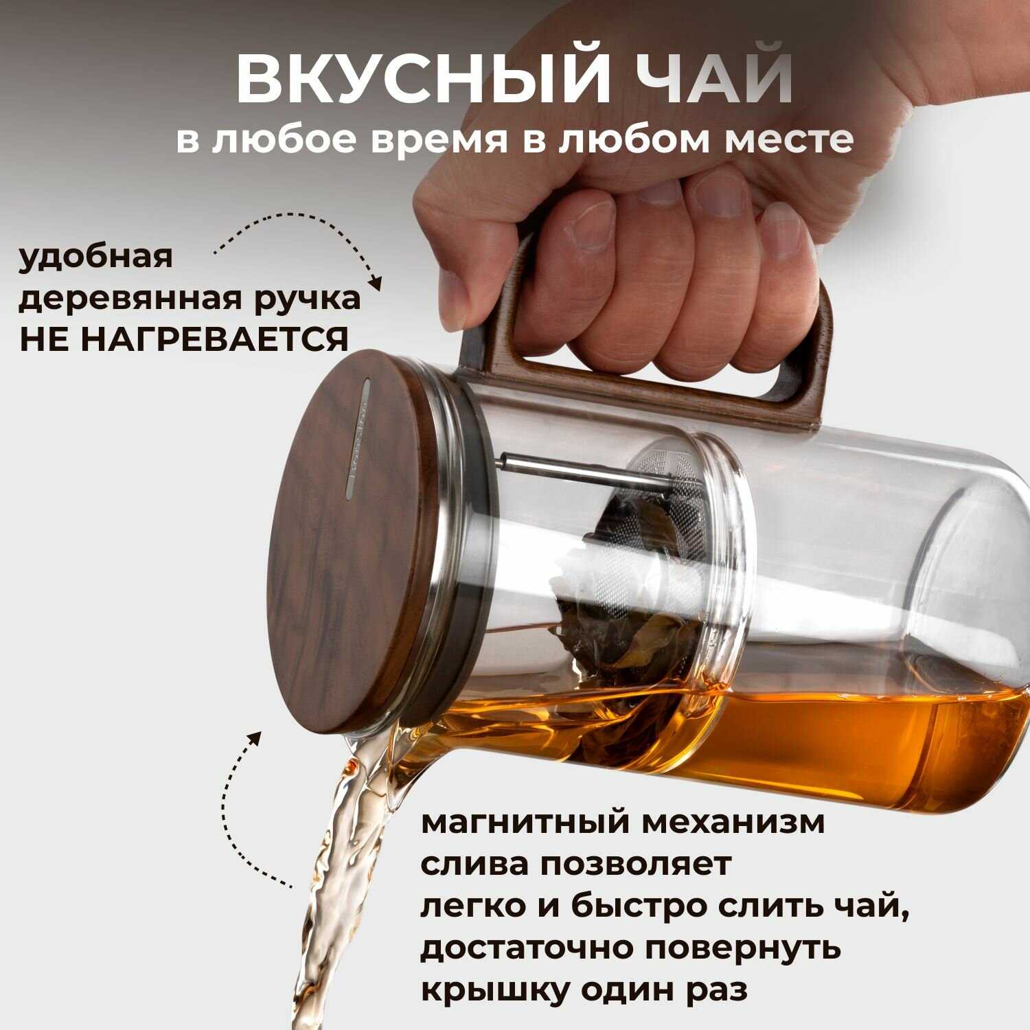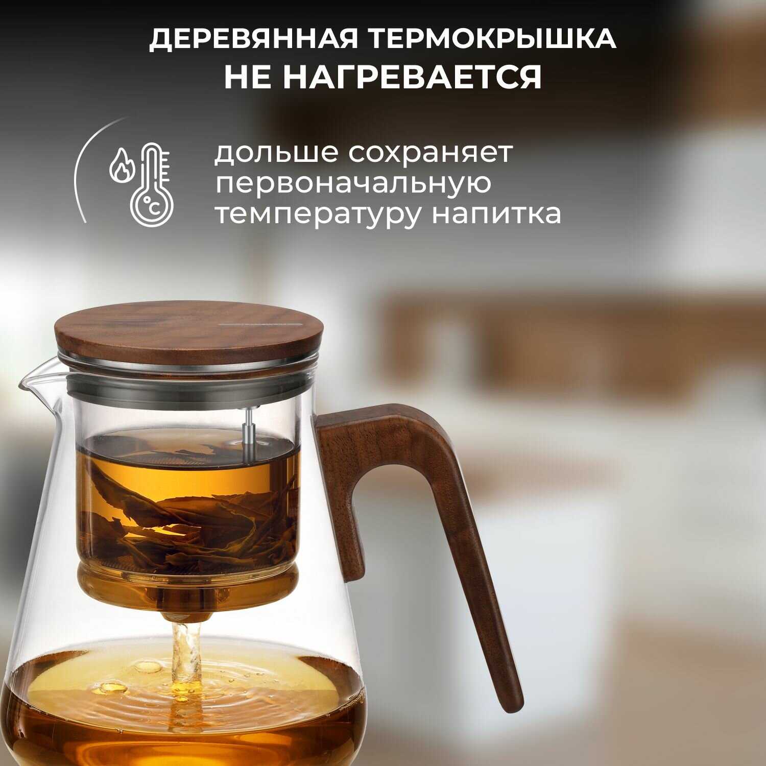 - Конструкция включает деревянные (ручка, крышка) и металлические (ситечко, клапан) элементы, что создаёт премиальное тактильное ощущение и исключает контакт чая с пластиком.