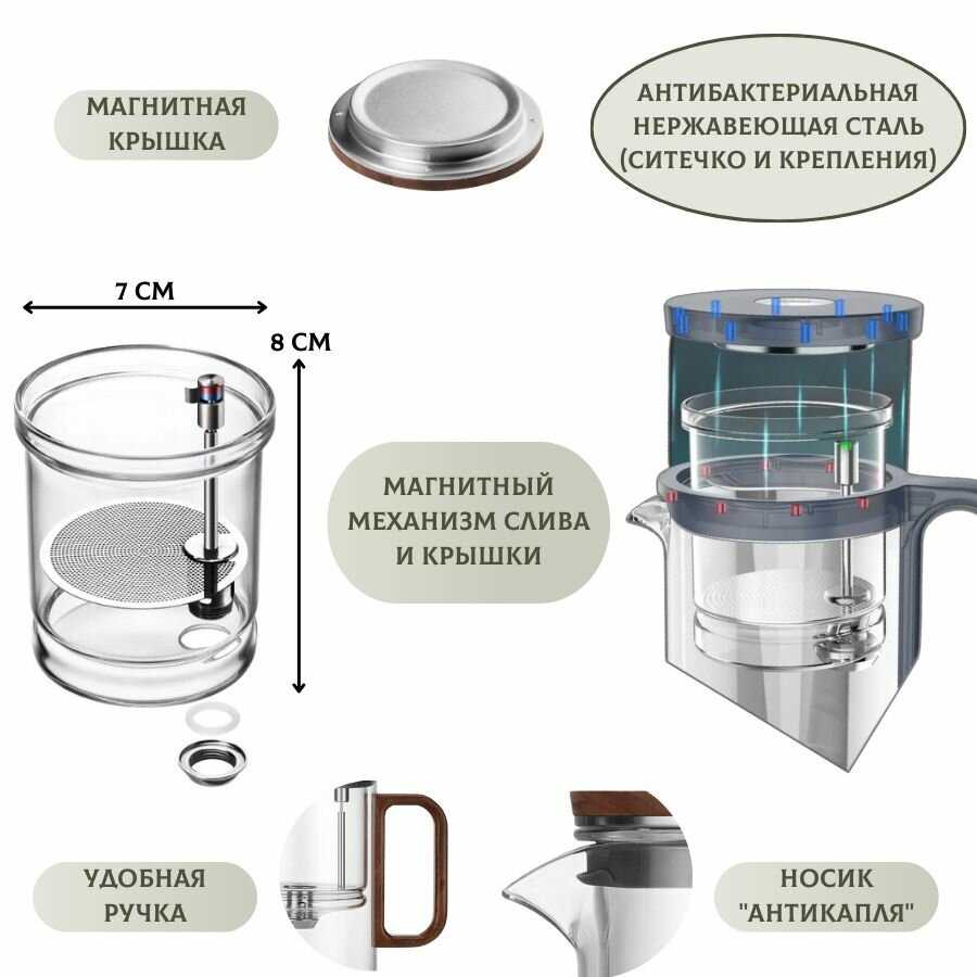 Механизм слива основан на магнитном соединении штока и кнопки. После нажатия кнопки шток фиксируется в открытом положении за счет магнита, что позволяет сливать весь чай, не удерживая кнопку пальцем. Некоторые пользователи отмечают, что для идеального срабатывания иногда требуется слегка провернуть или поправить крышку, так как на точность контакта может влиять небольшой угол установки колбы. В целом, механизм считается более надежным и долговечным по сравнению с традиционными пластиковыми кнопками, которые часто ломаются. -