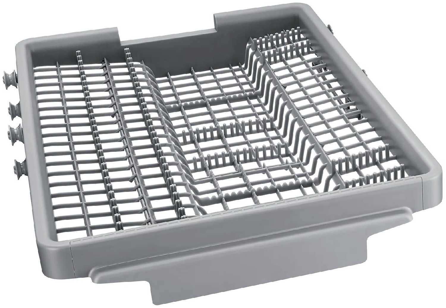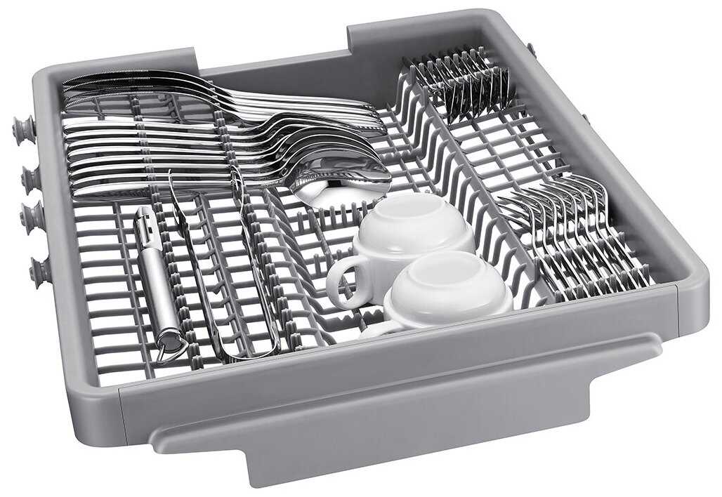 - Верхний лоток для вилок и ложек позволяет освободить место в основных корзинах для крупной посуды.