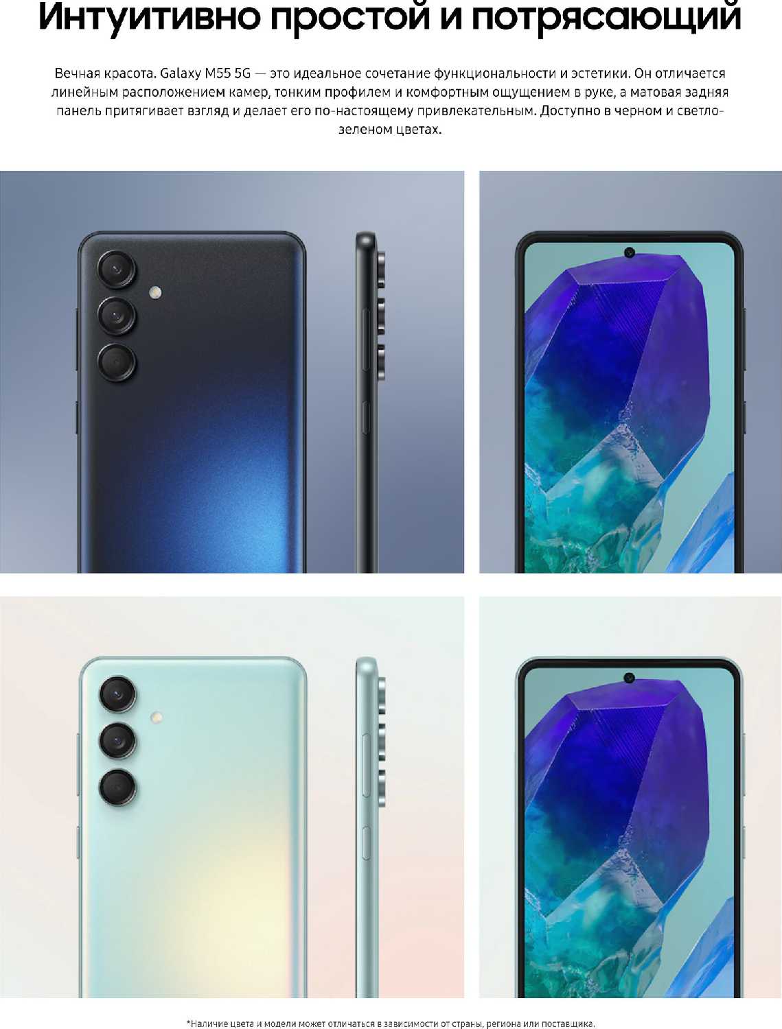 Выбор пал на четыре модели: А26, А36, А56, М55. Посмотрел характеристики устройств и больше всего мне понравилась модель А56, очень приличная за свою цену и конечно по классу чуть выше остальных. Но так как решил ещё и жене менять телефон, то два телефона А56 несколько дороговато выходит, поэтому выбрал М55 и не очень дорого, и модель телефона вполне себе приличная. Подержал в руках А26, А36 и в сравнении с М55 эти модели ничем не отстают и не выделяются, разница только в начинке и исполнении корпуса. При этом у М55 экран супер амолед плюс и в сравнении с А26 у М55 больше режимов съёмки.