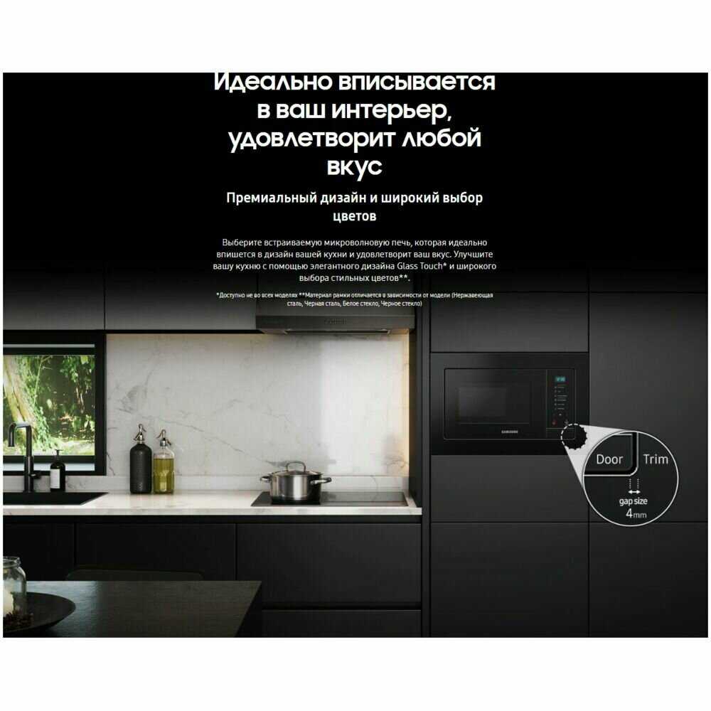 Дизайн и интеграция в кухню: Микроволновка вписывается в современный дизайн кухни, особенно с другими приборами Samsung, как духовым шкафом в похожей стилистике. Темно-серый или графитовый цвет рамки сочетается с черной дверцей, но 25% пользователей отмечает, что рамка светлее, чем на фото, и не стеклянная, а под металл. Это выделяется на фоне конструкции, делая вид менее единым, и для некоторых критично. Внутренняя биокерамика выглядит премиально по сравнению с нержавейкой в других моделях. Общий внешний вид стильный и аккуратный, подходит для минималистичных интерьеров. Рамка нежная, пластик может царапаться при неаккуратном уходе, как в единичных случаях. Пользователи с новой кухней хвалят точное соответствие размерам ниши без подгонки. Дверца открывается легко после обкатки, но изначально тугая. В 10% отзывов упоминают, что цвет ближе к серому, а не черному металлик, что влияет на выбор. Несмотря на это, 70% довольны эстетикой в реальной установке.