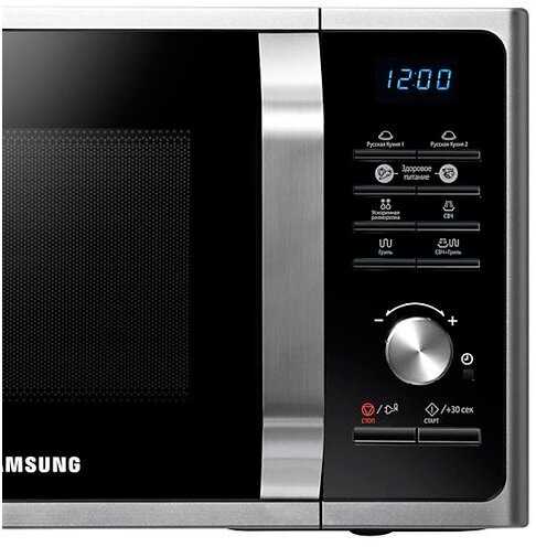 Управление и эргономика в повседневной эксплуатации: Основным достоинством интерфейса пользователи единогласно признают физические кнопки вместо сенсорной панели, что повышает надежность и тактильное удобство управления. Критике подвергся измененный алгоритм работы энкодера (крутилки): для установки времени разогрева теперь требуется предварительное нажатие кнопки «СВЧ», тогда как в более старых моделях Samsung можно было сразу крутить ручку и запускать процесс, что многими оценивается как регресс в удобстве. Функция быстрого старта на 30 секунд («Старт 30 сек») работает исправно и позволяет мгновенно запустить нагрев на максимальной мощности с возможностью последующего добавления времени такими же 30-секундными интервалами, однако возможность изменять время вращением энкодера непосредственно во время работы, присутствовавшая в прошлых поколениях, в данной модели отсутствует. Звуковые сигналы по окончании работы характеризуются как громкие, но пользователи подтверждают наличие функции их полного отключения путем длительного нажатия комбинации кнопок «Стоп» и «Старт». Часы на дисплее продолжают работать при отключении питания, так как не имеют резервного питания от батарейки, что также отмечается как неудобство по сравнению с некоторыми другими моделями.